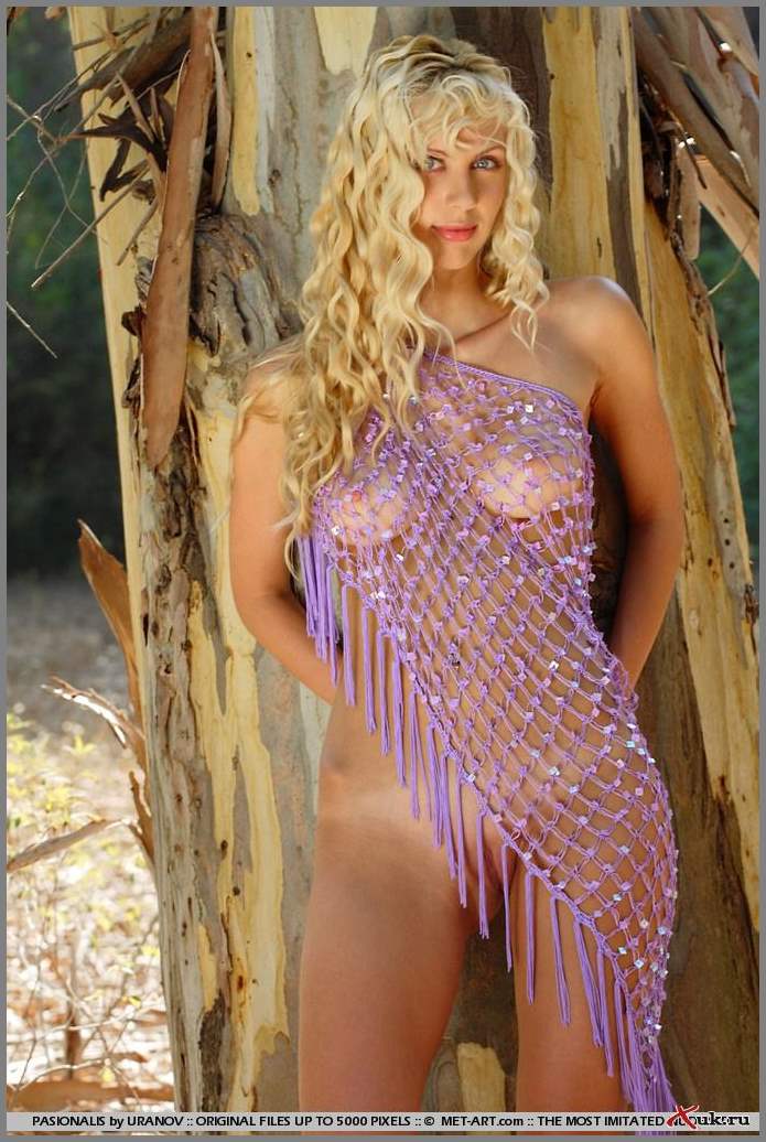 Кучерявая губастая блондинка похожа на красивую русалочку. Она позирует на природе возле старого дерева, совсем голая и только небольшой платочек прикрывает ее попку. Попочка сочная и аппетитная и постоянно перед глазками. Красавица приятно и сладко улыбается.