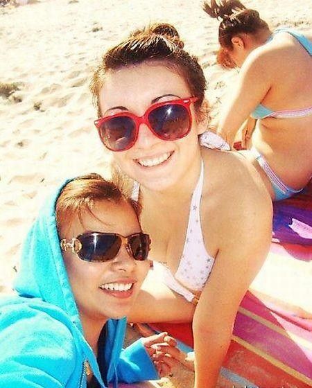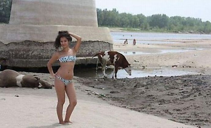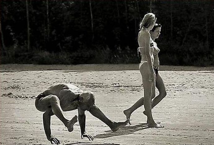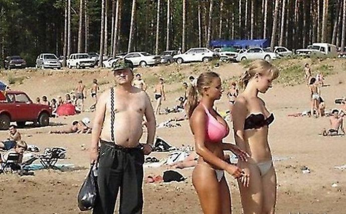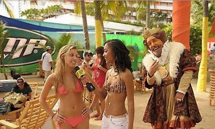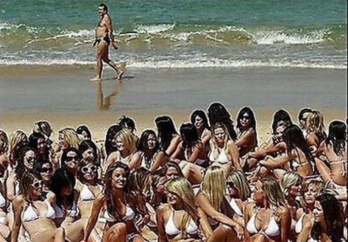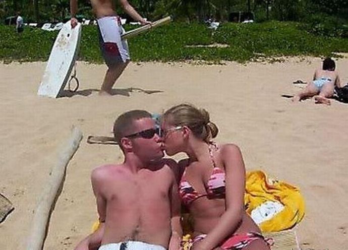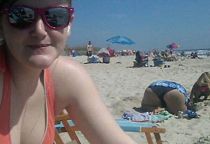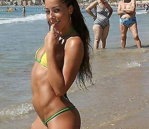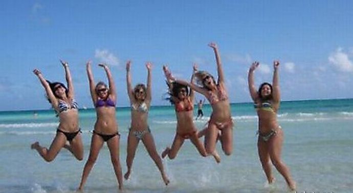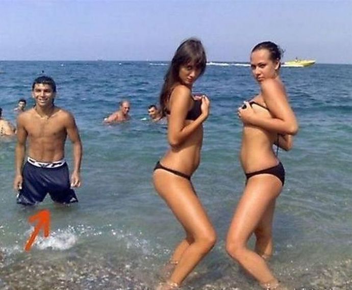 Девушки активно позируют перед камерами на пляже и хотят похвастаться своей фигурой, но стоящие парни сзади от этого вида возбуждаются и у их наступает эрекция.