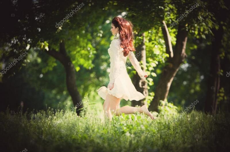 Девушка красотка в платье бежит в лесу