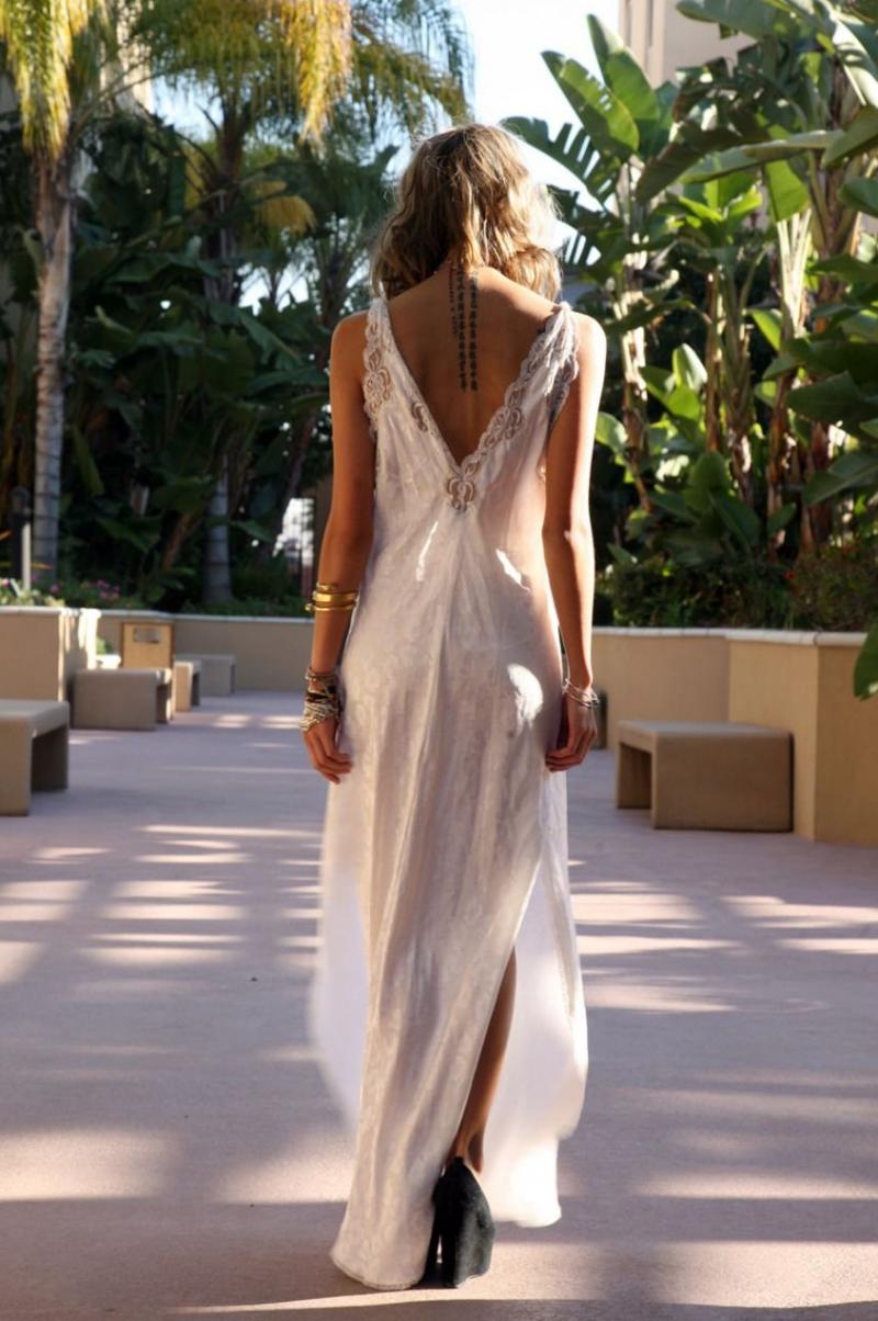 Девушка красотка в белоснежном платье сзаду