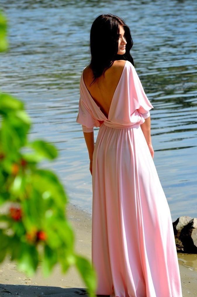 Девушка красотка в розовом платье со спины