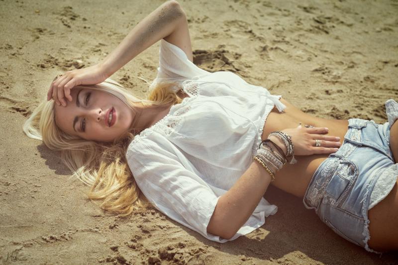 Девушка красотка в шортах на песке