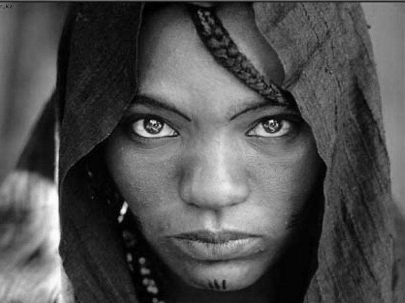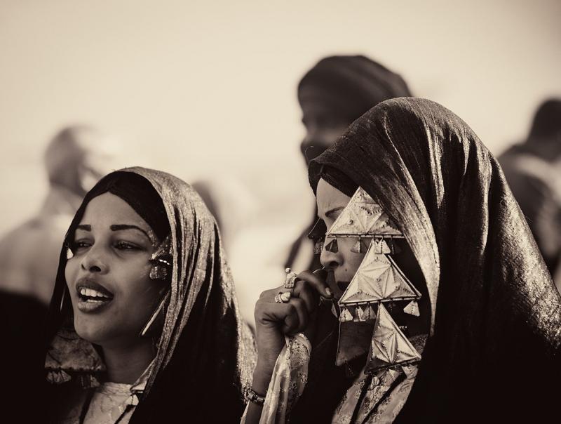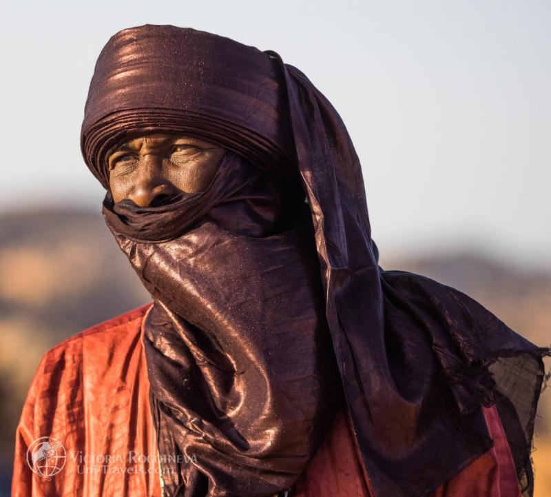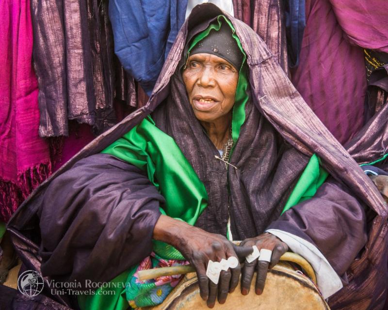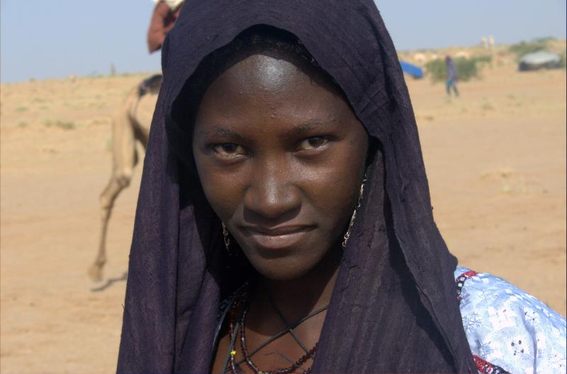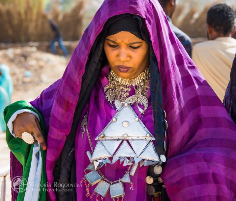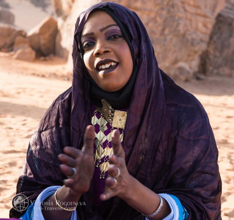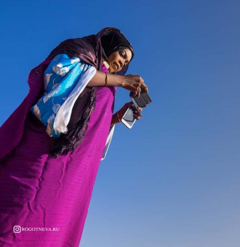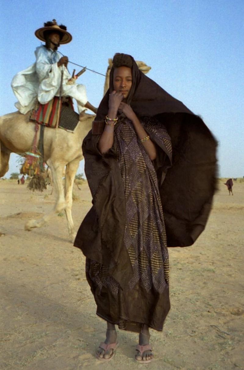 Африканка в длинных одеяниях с верблюдом в пустыне