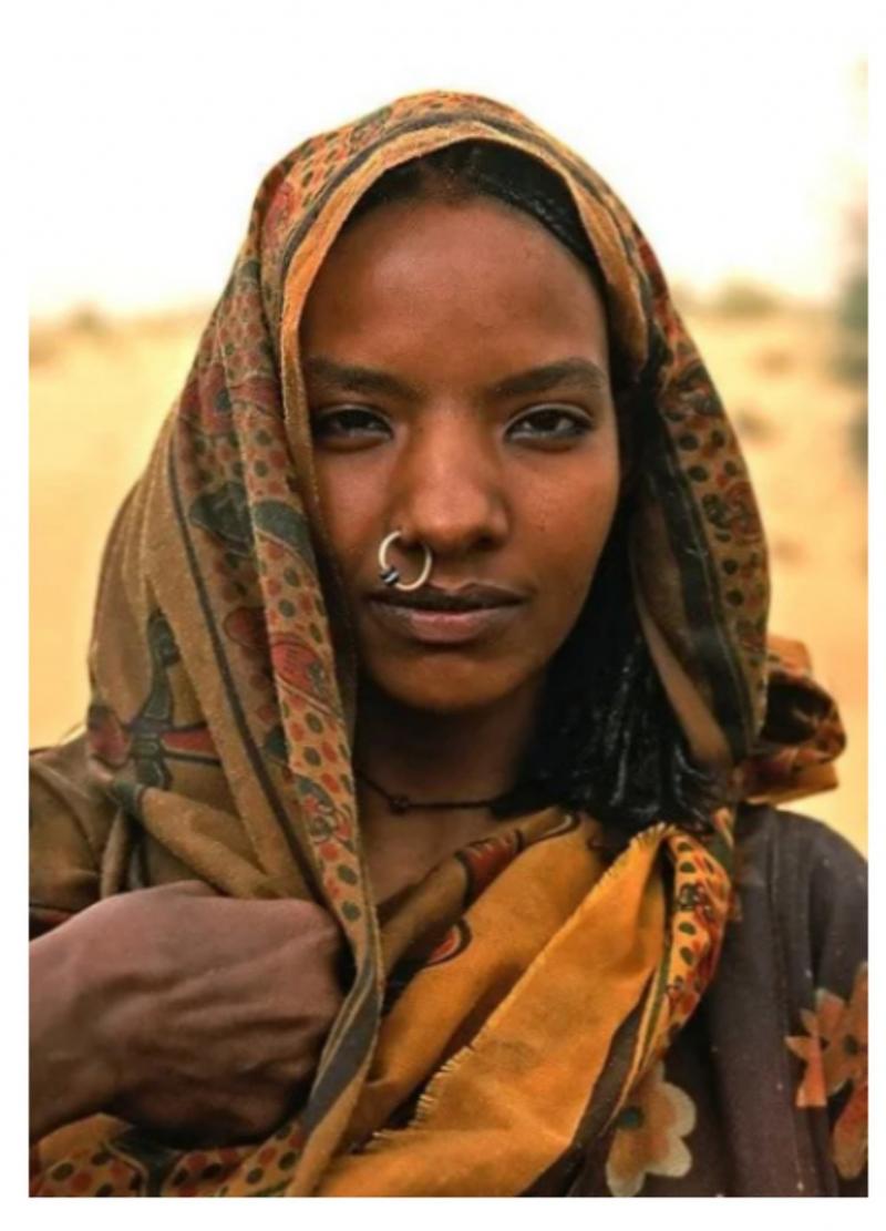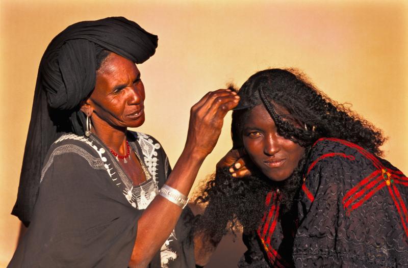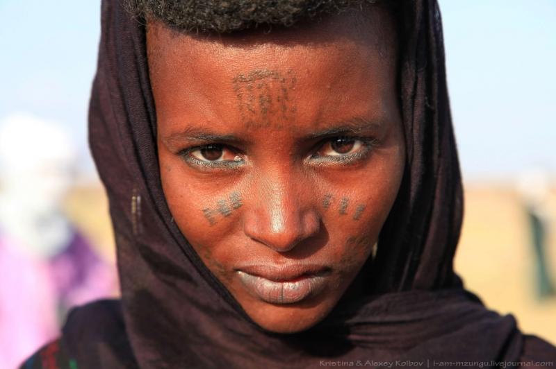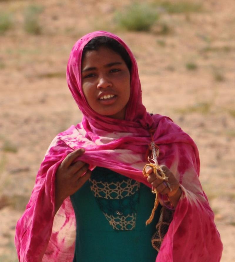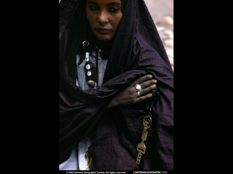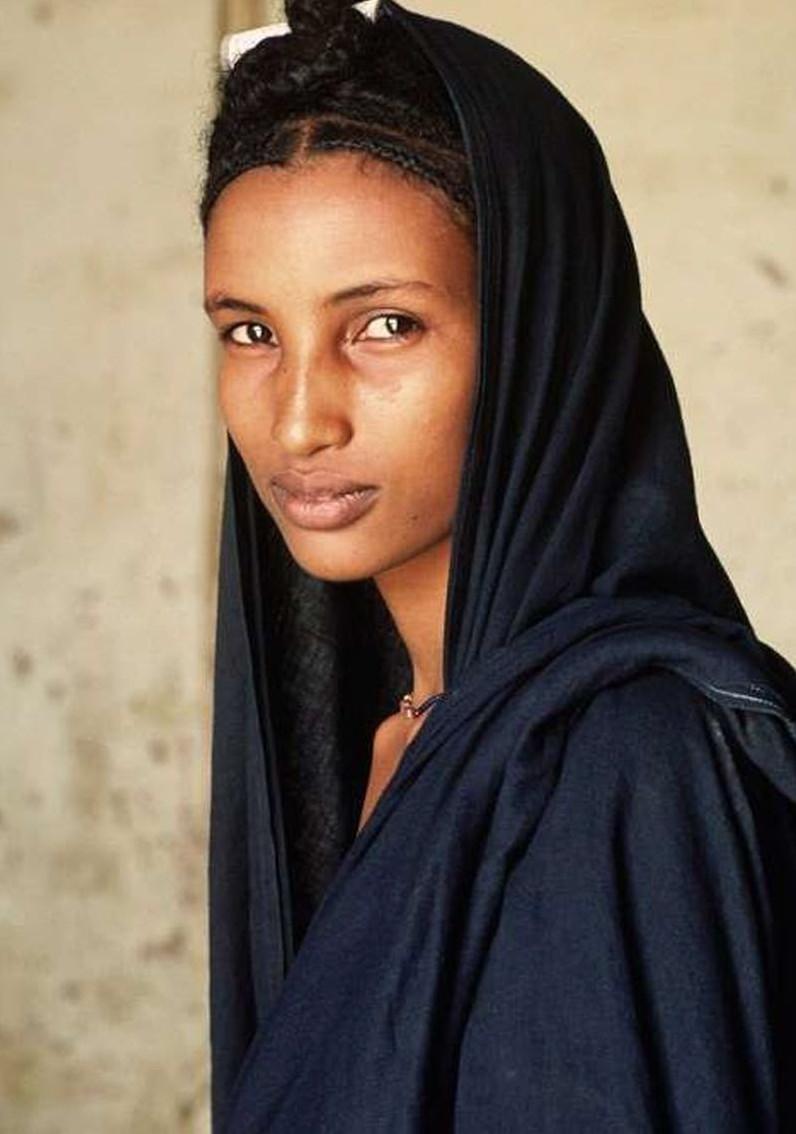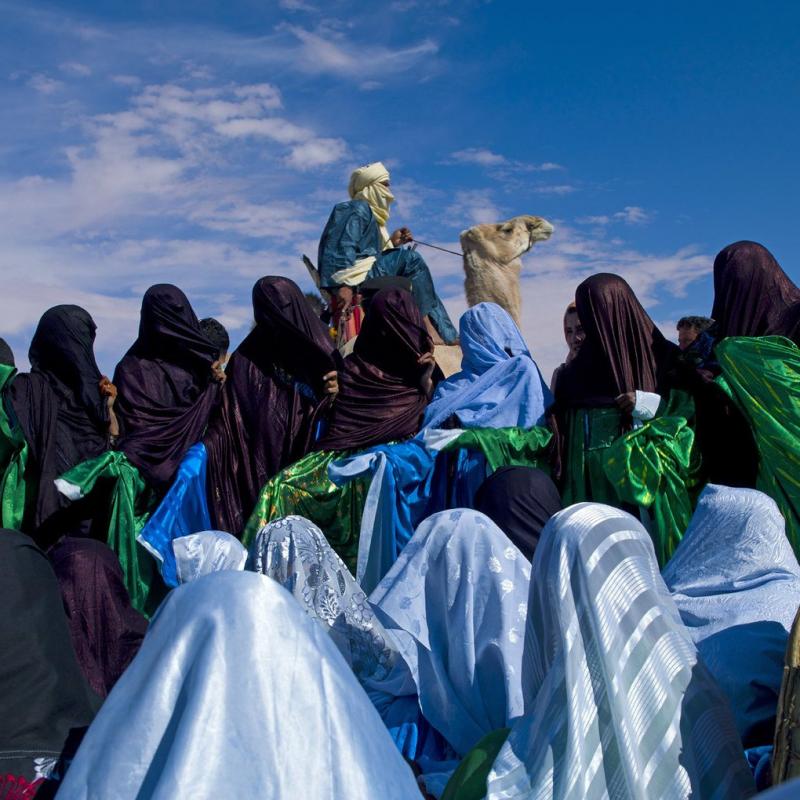 Африканка в длинных одеяниях с верблюдом в пустыне