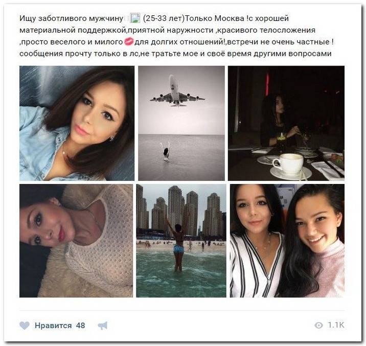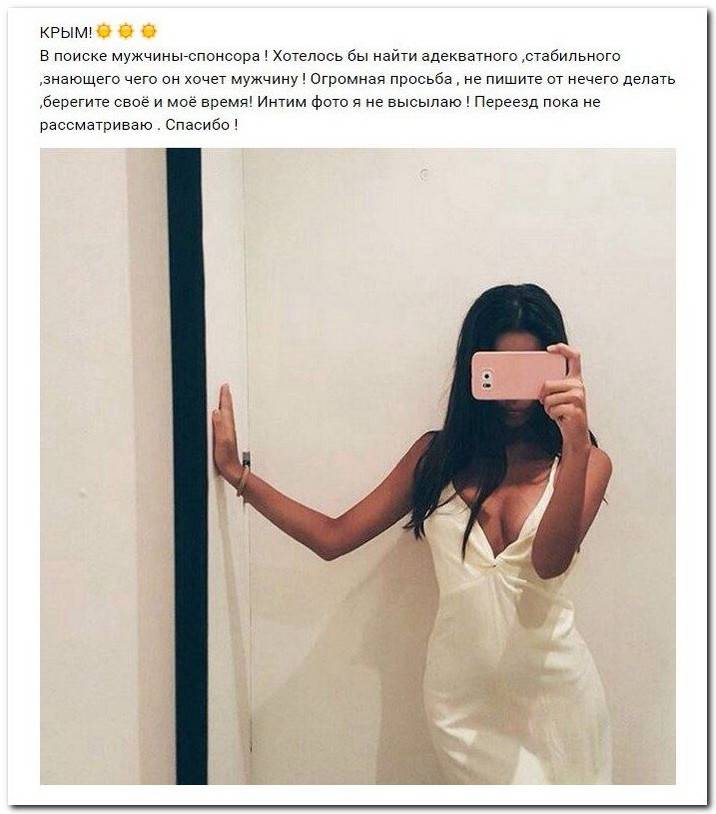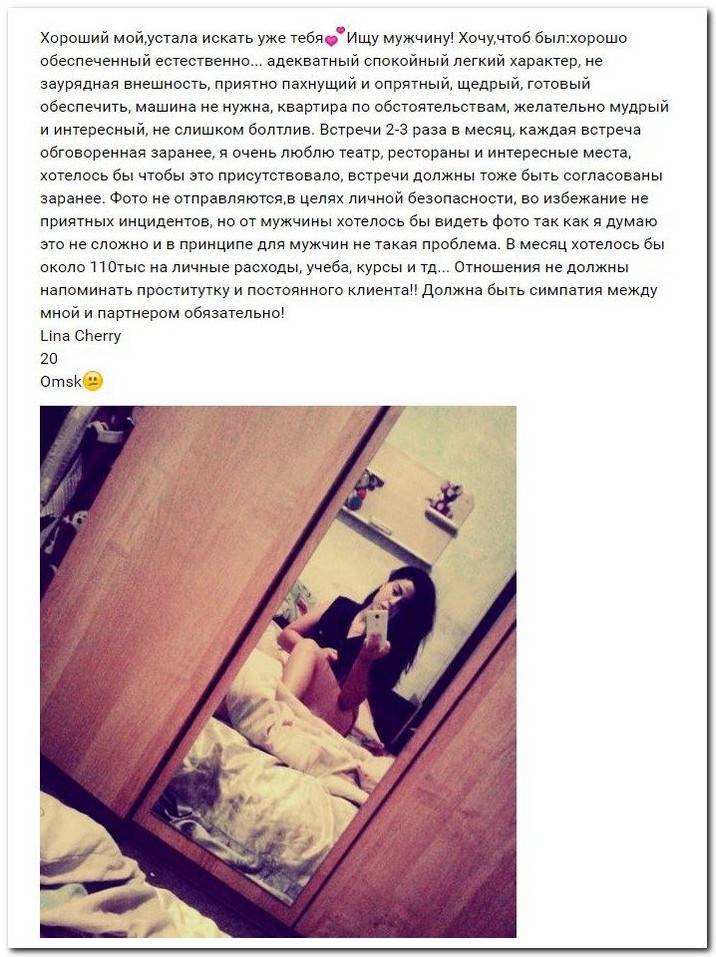 Эти наивные девушки хотят жить красивой жизнью и ничего не делать. Они надеются, что богатые спонсоры увидят свою красоту и, в свою очередь, встанут в очередь и предложат свою помощь. Некоторые даже пишут, что никто не близок, им приходится платить исключительно за приятное общение.