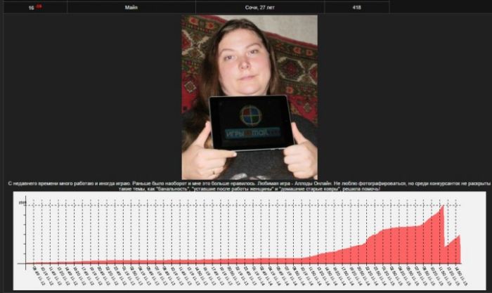 1-го ноября обслуживанием Игры@Mail.Ru было объявлено о начале приема фото на конкурс «Мисс Игры@Mail.Ru». Среди наиболее чем 450 конкурсанток фаворитом оказалась женщина с «необычной» для схожих конкурсов наружностью, которую поддержал один популярный развлекательный веб-сайт. Однако скоро данная участница была исключена из конкурса самим организатором.