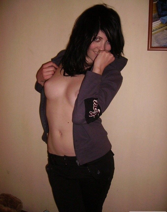 Брюнетка перерастающая в начинающую красотку эмо решила продемонстрировать своё пикантное голое тело, сначала такая бля скромница решила подразнить фотографа, а потом так возбудилась, что разделась и запехала свои пальца в киску.