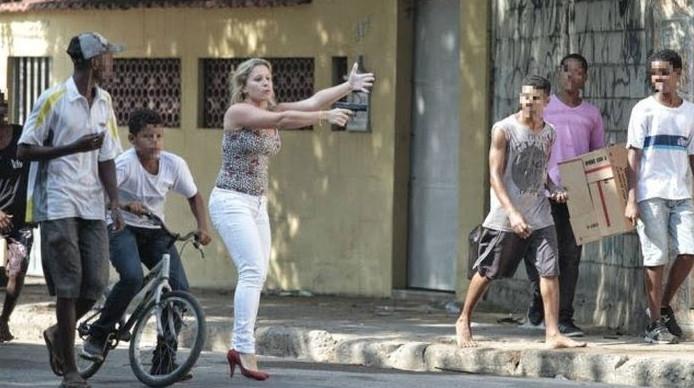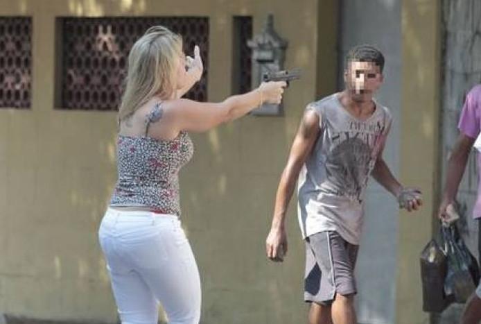 Девица с пышноватыми формами, махающая пистолетом на этих фото, не рядовая гражданка, а сотрудник милиции. Майор Фабиана Силва, заместитель командира 22 батальона военной милиции Рио-де-Жанейро, запечатлена в процессе задержания преступников.