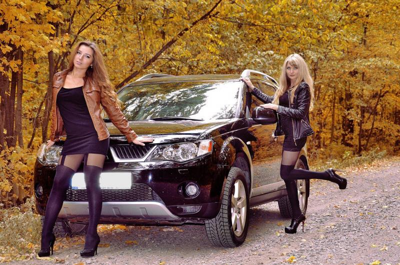 Очаровательная автоледи прикасается к своему мужественному автомобилю