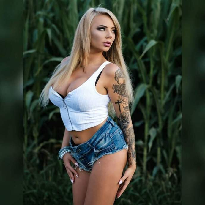 Очаровательная татуированная блондинка с чувственными губами и женственной фигурой. Фотомодель, обожающая домашних животных, успешно ведёт свой красочный инстаграм и наслаждается жизнью.