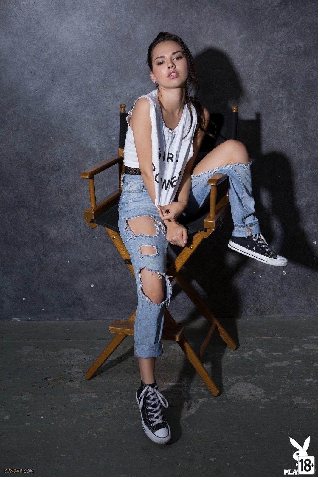 Молодая модель позирует в порванных джинсах и боди, затем раздевается, показывая упругую попку и гладкую письку.…