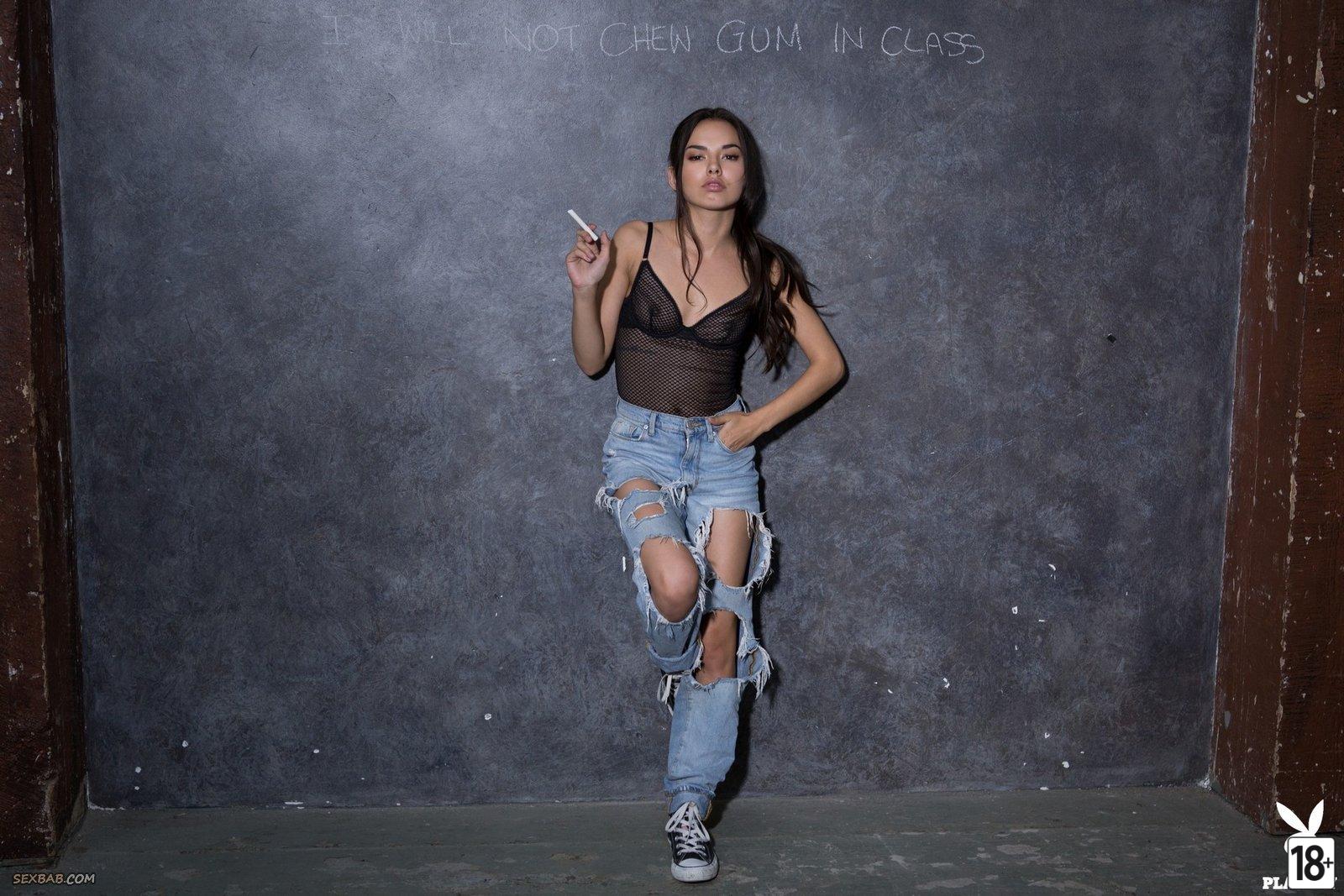 Эротичная модель в порванных джинсах и полупрозрачном боди