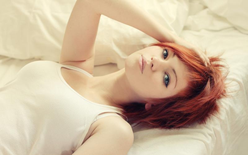 Девушка красотка с ярко-рыжими волосами и темной помадой