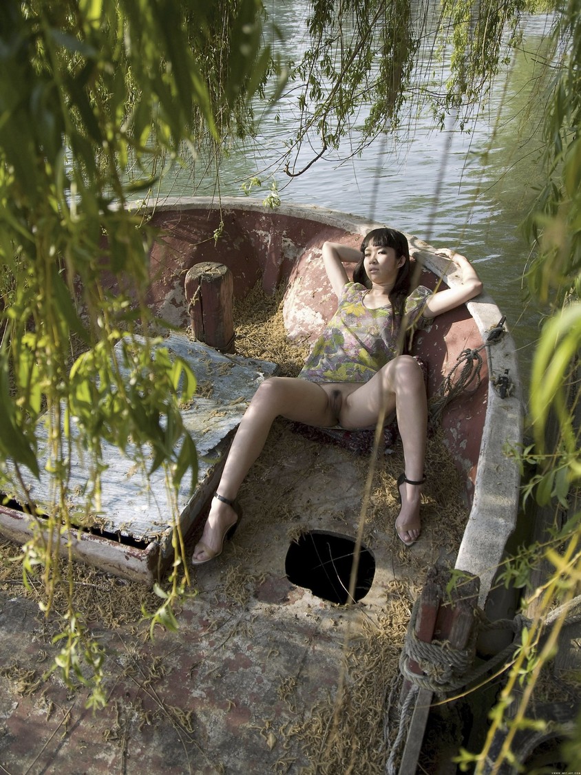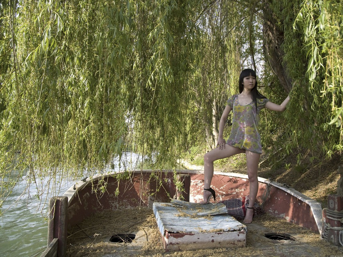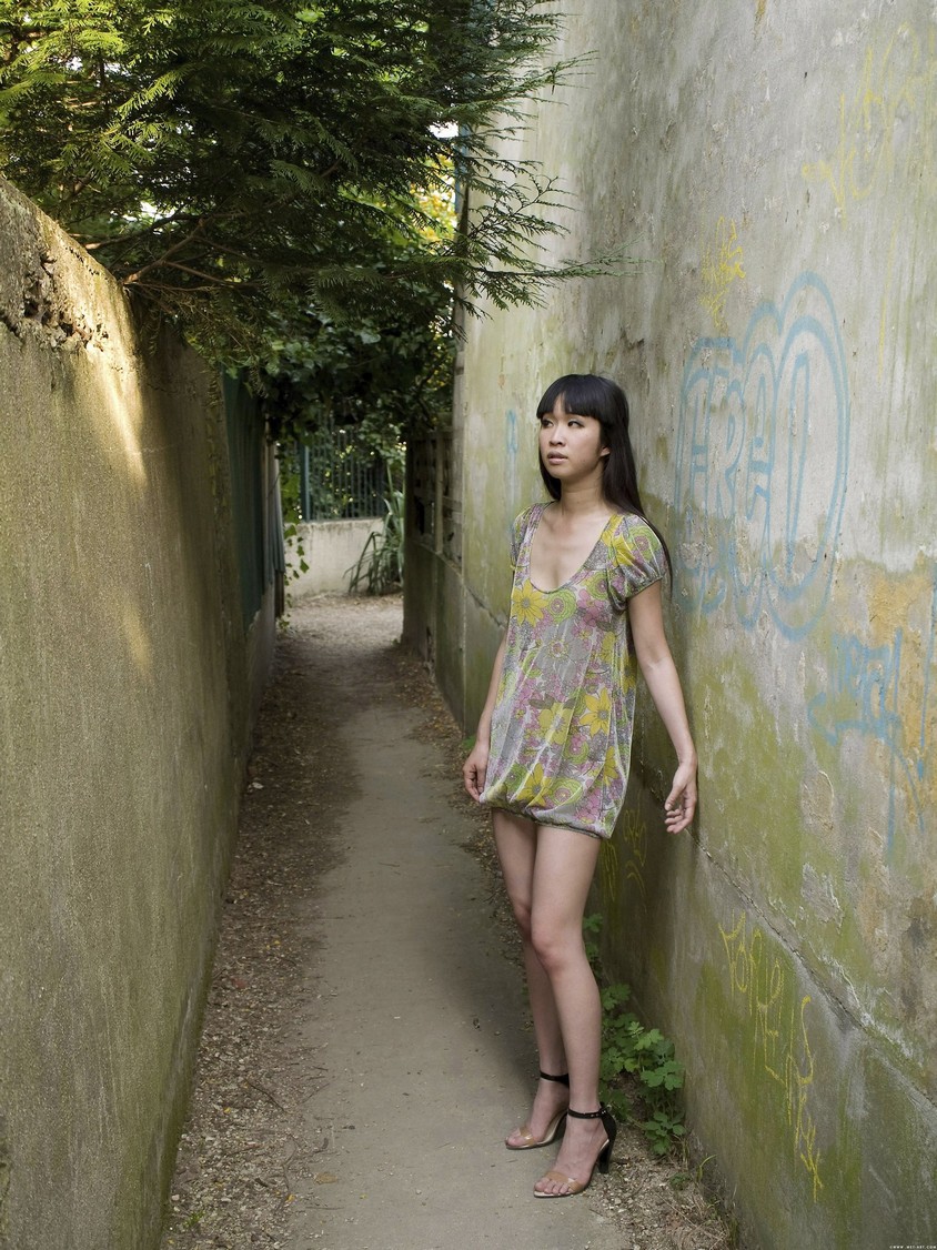 шикарная азиатка стоит в одиночестве. Она стоит между двумя стенами, с задумчивым взглядом. Одинокая азиатка одета в очень красивое платье и красивые туфли. В этой одежде она выглядит очень красиво, на заднем плане видны деревья и остальные растения.