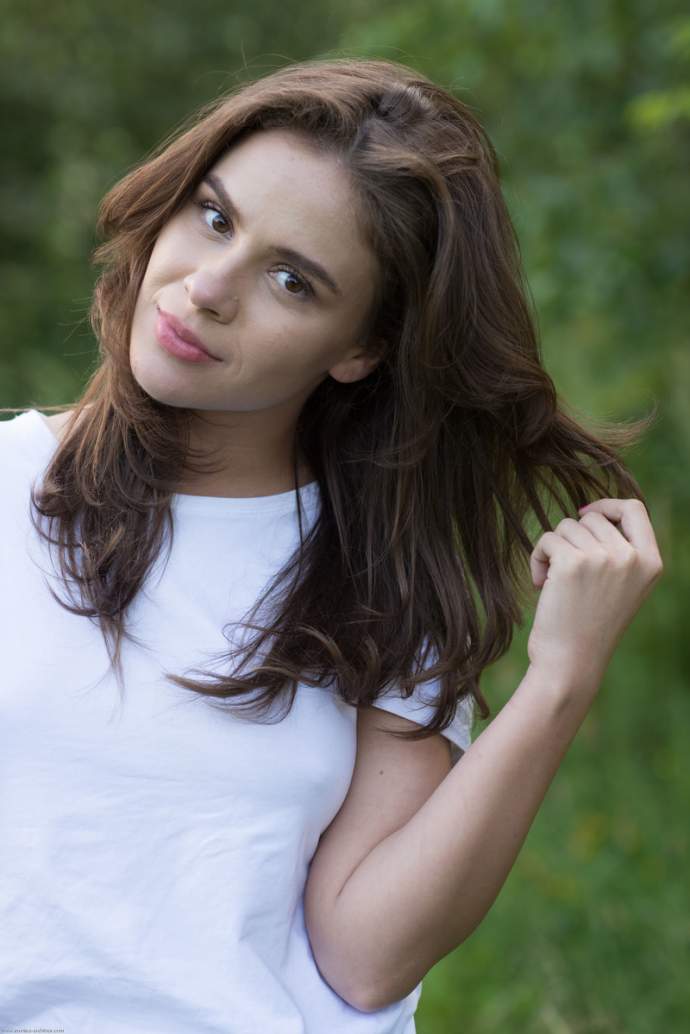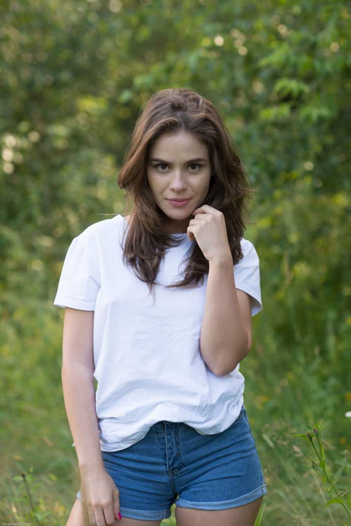 Парень уговорил попозировать подругу в шортиках в лесу.
