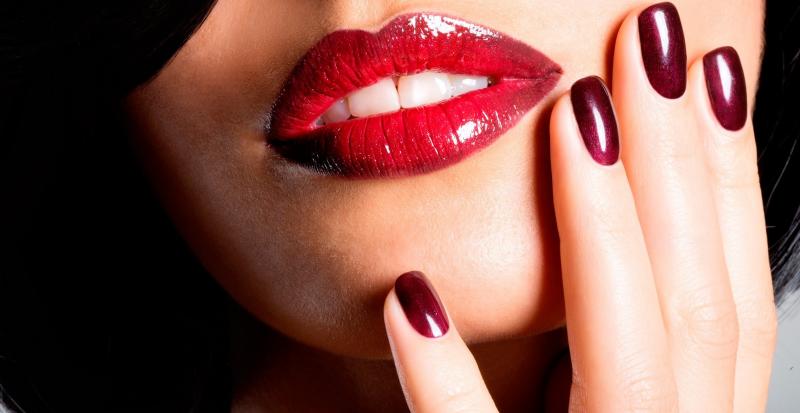 Девушка красотка с красноватыми губками и ногтями