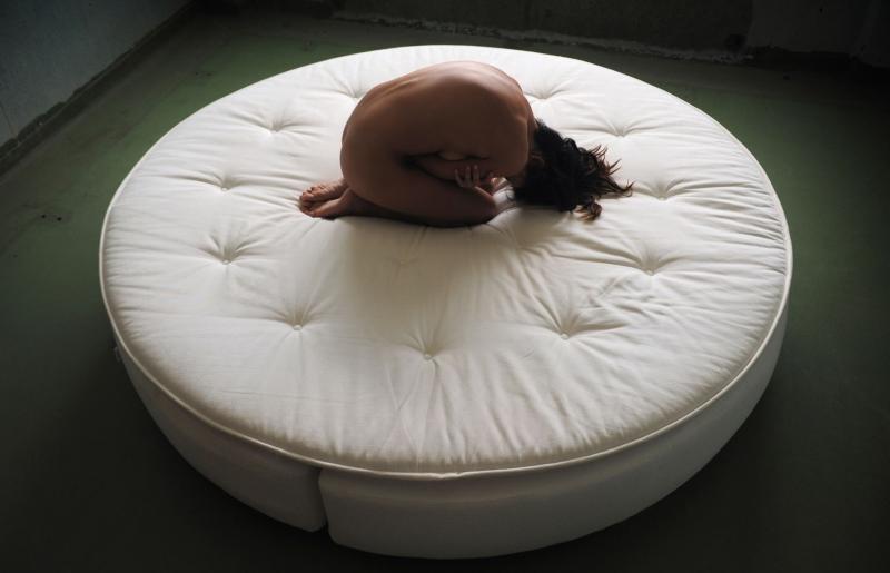 Невероятно страстная молодая девушка со стройной спортивной фигурой ложится на круглую кровать и эротично меняет ракурсы, медленно стягивая пеньюар и черные чулки. Полностью обнаженная стройная брюнетка раздвигает ноги и подробно показывает свои бритые лобковые волосы и киску, а также маленькие груди.