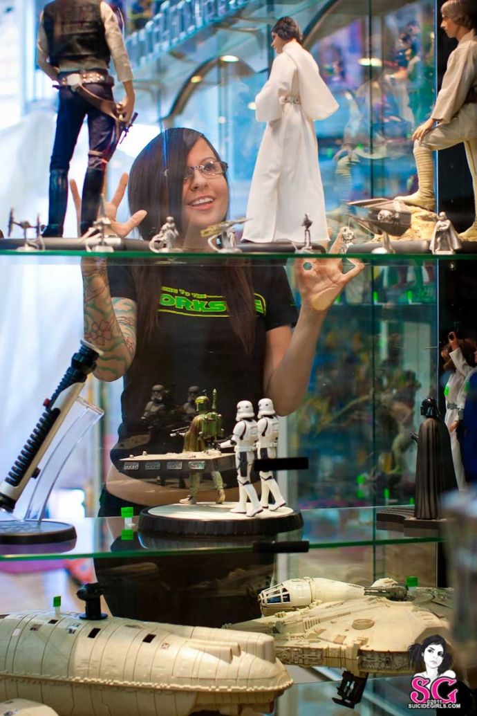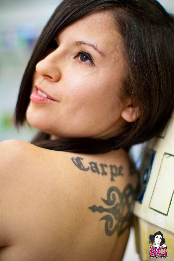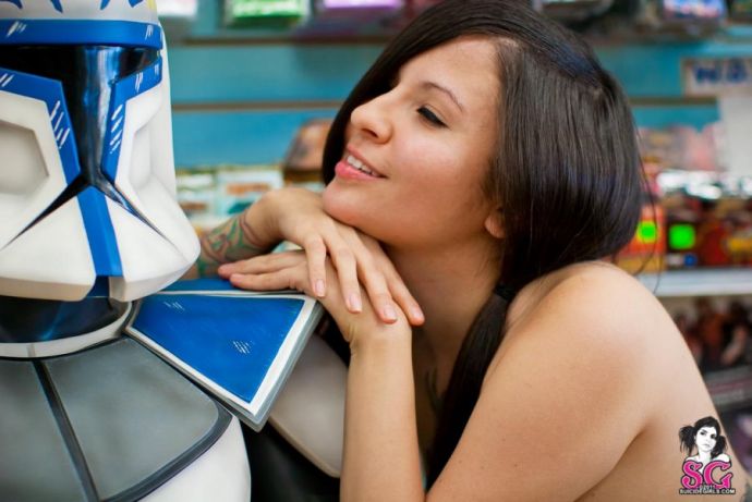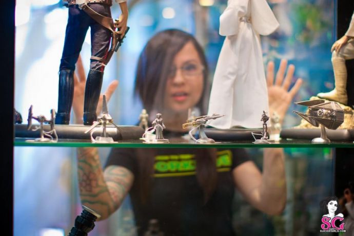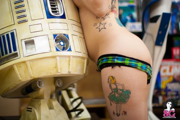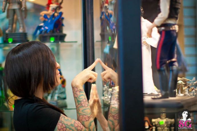 Татуированная девушка работает в магазине, но видимо по её стилю одежды, вернее сказать, что её почти нет, посетители не спешат туда, вот и приходится изобретать как приманить к себе внимания.