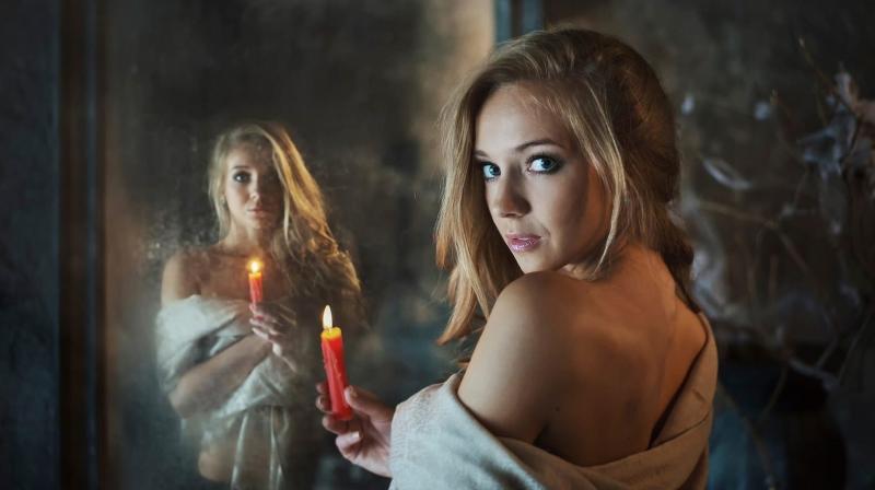 Фото женщин в зеркале с лампой