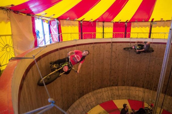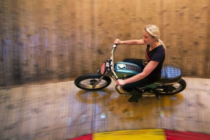 Британки Керри Камерон, Джами Старр и Абигайль Фокс веселят люд необыкновенными мотогонками, колеся на байках по стенке погибели. Храбрые участницы трио "Кен-Фокс" — единственные дамы в Англии, которые исполняют этот трюк.