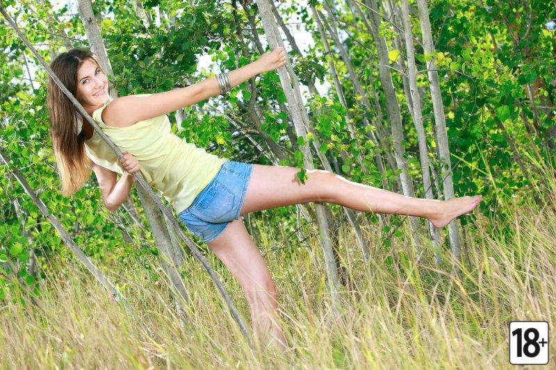 Эротический стриптиз на природе: обнаженная красотка в футболке и шортах