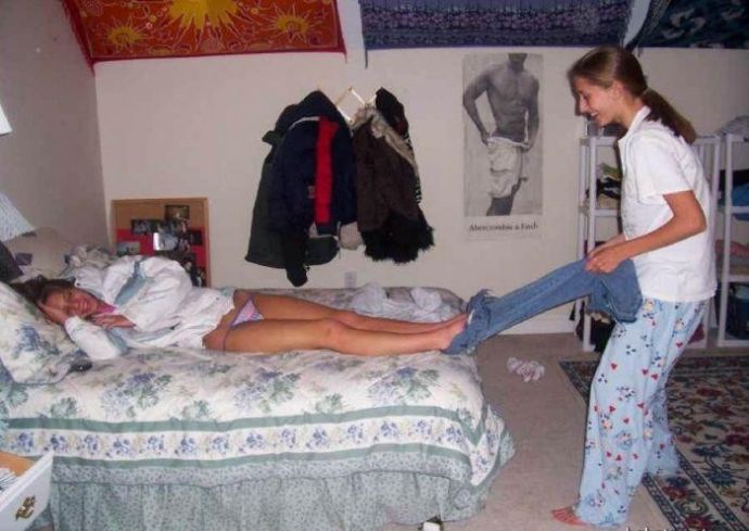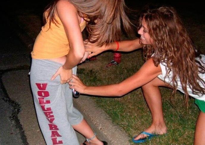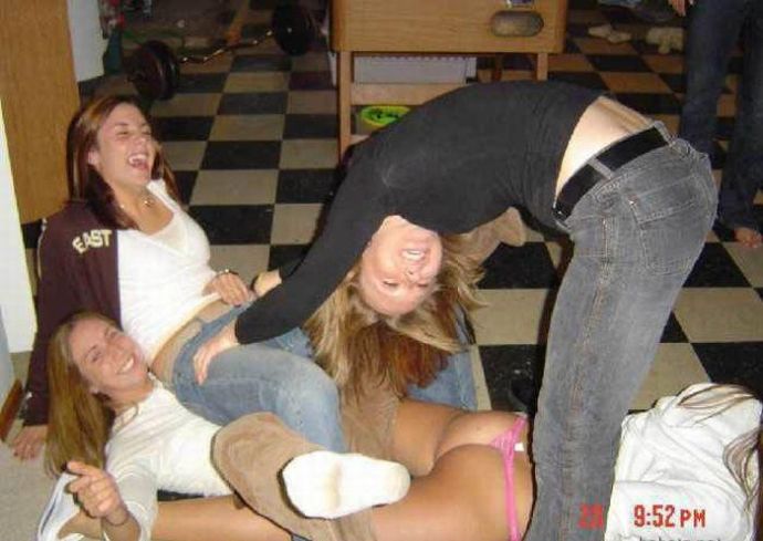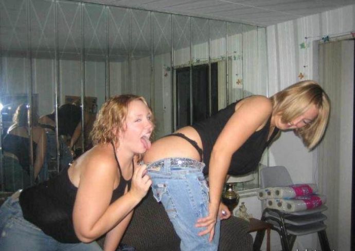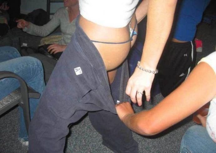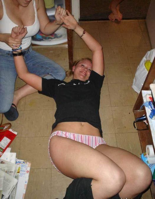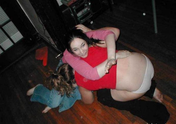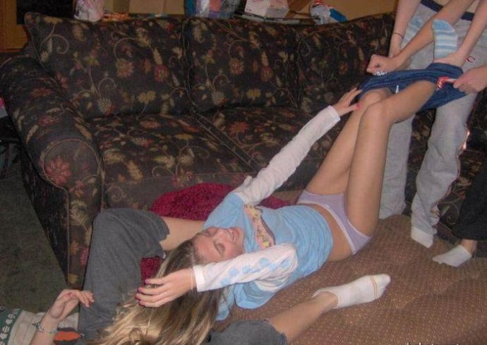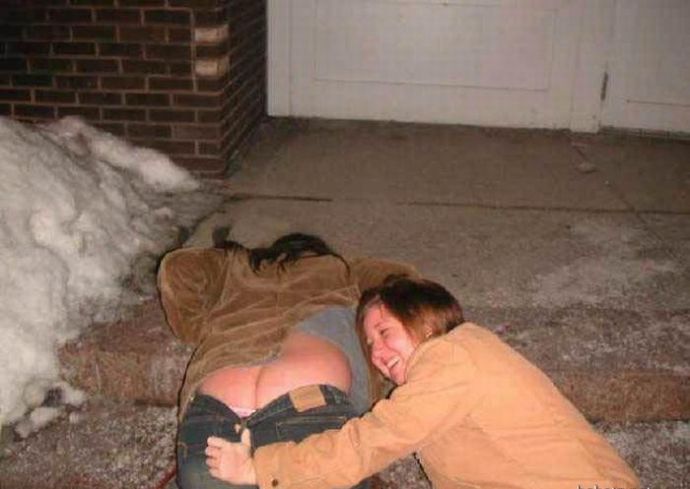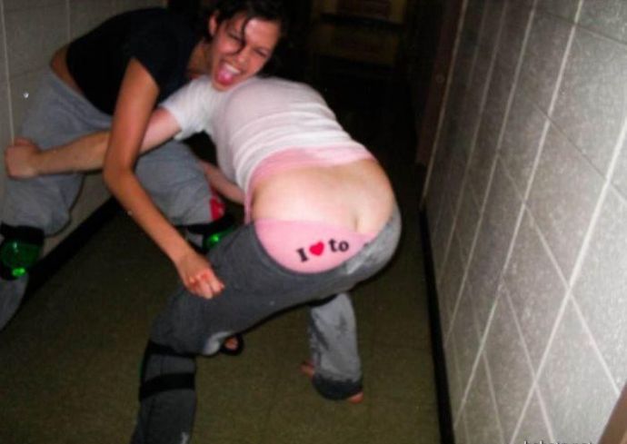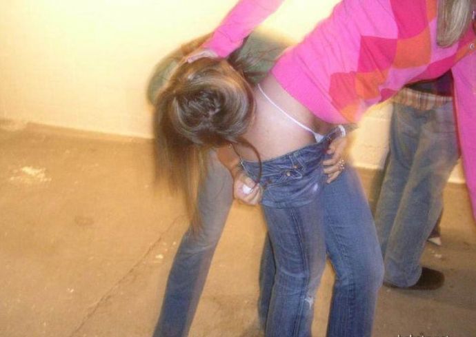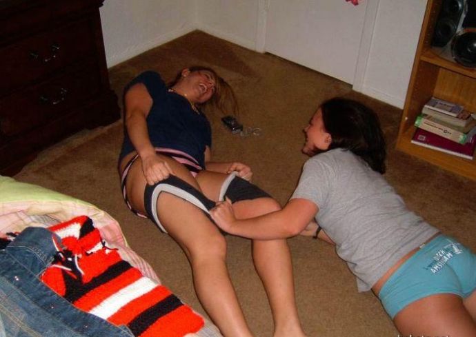 Этих пьяных девушек привлекает одежда, особенно штаны, они их пытаются снять любым методом, одна стягивает зубами, другая трясущими руками и всё для того, чтобы показать голую жопу.