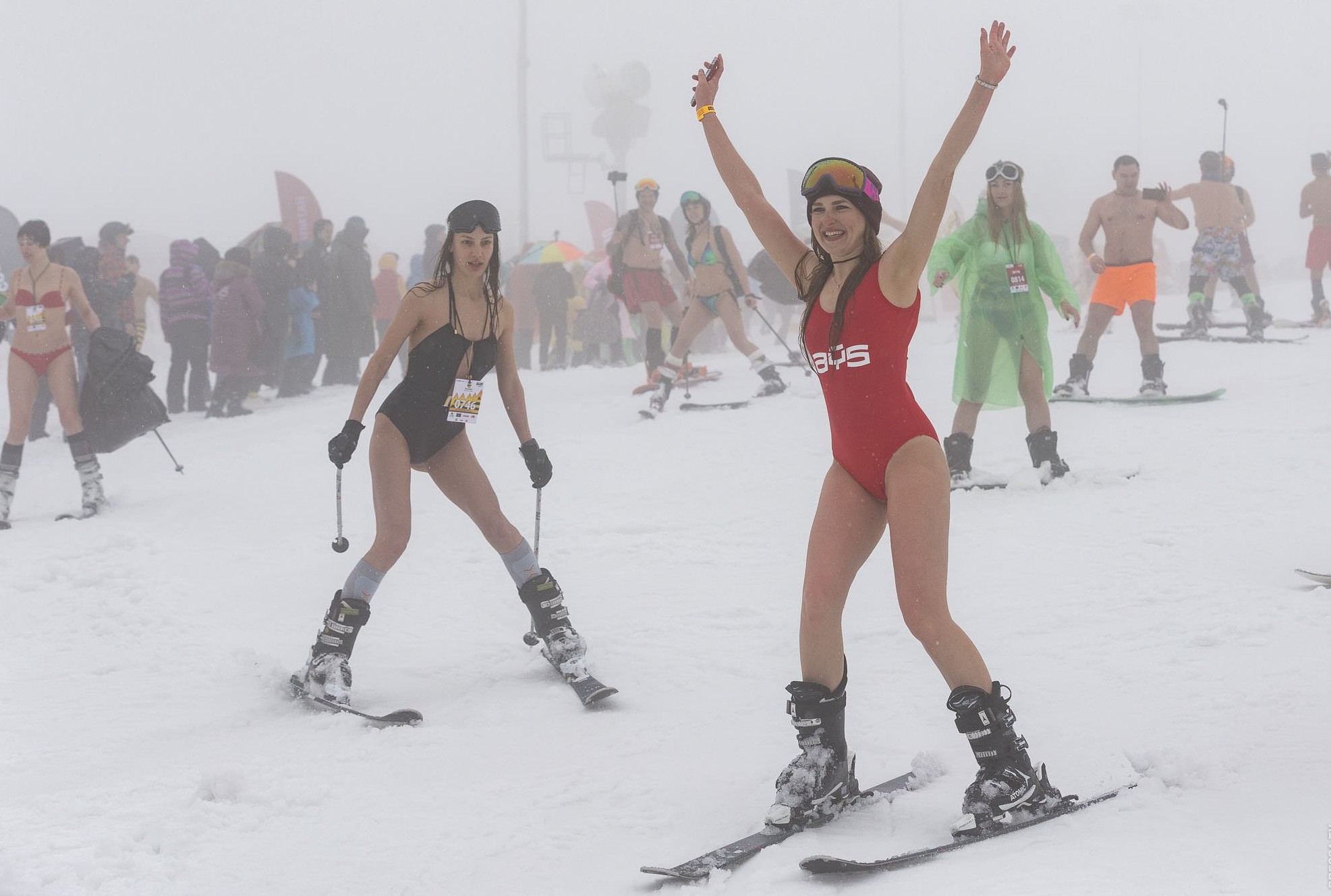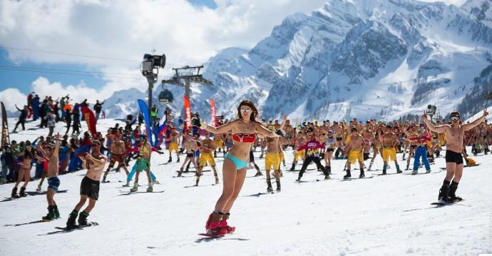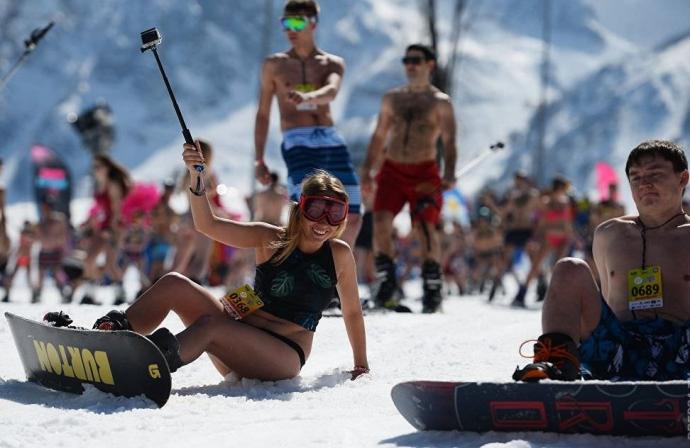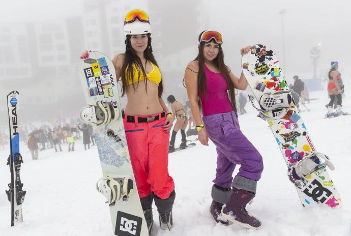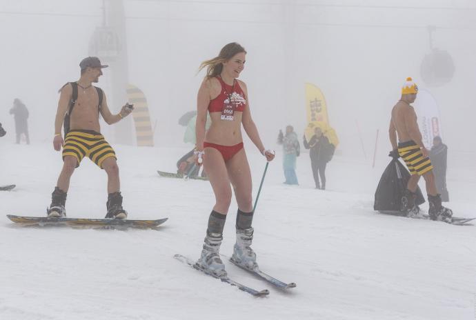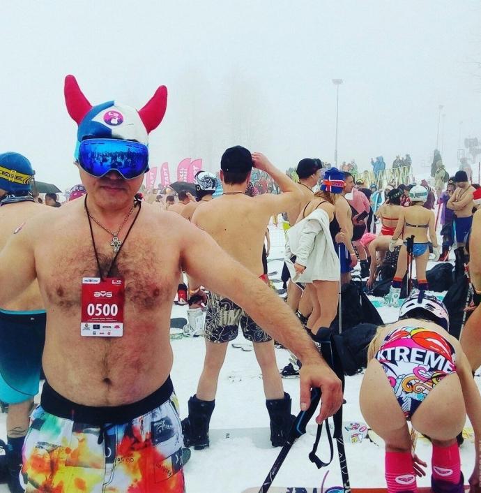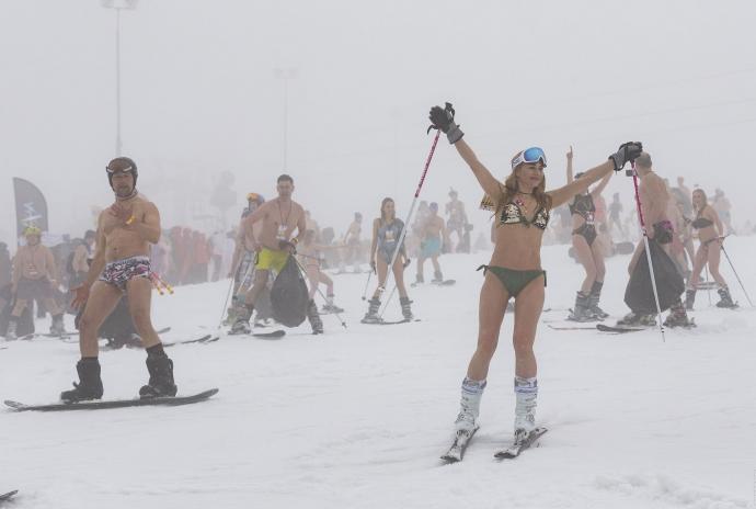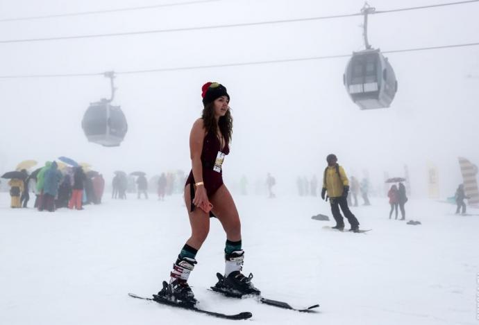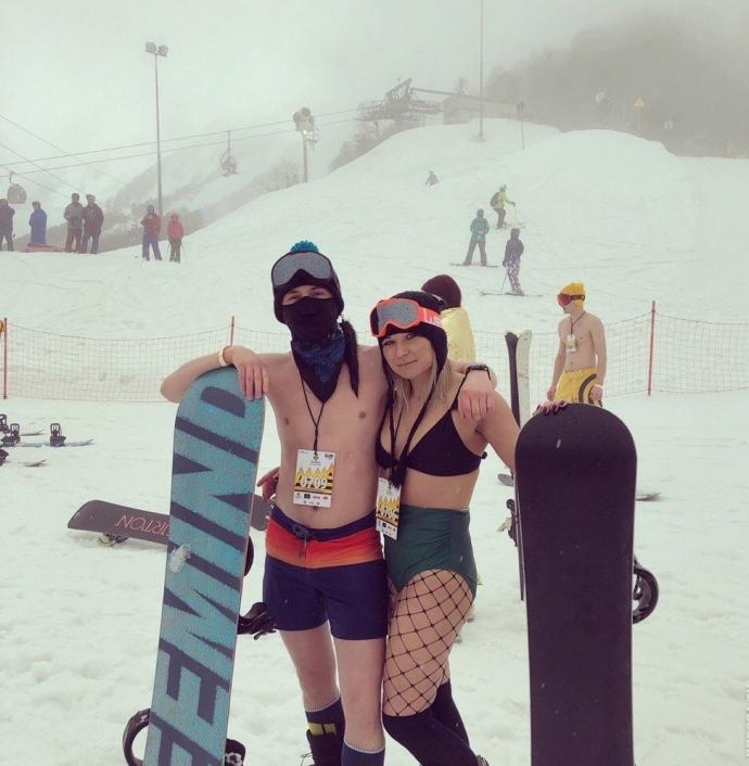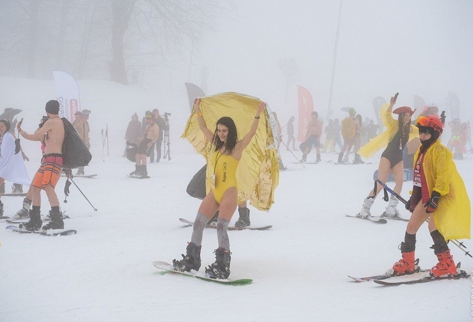 Кульминацией мероприятия стал спуск практически 900 сноубордистов и лыжников, на которых были надеты только купальные костюмы.