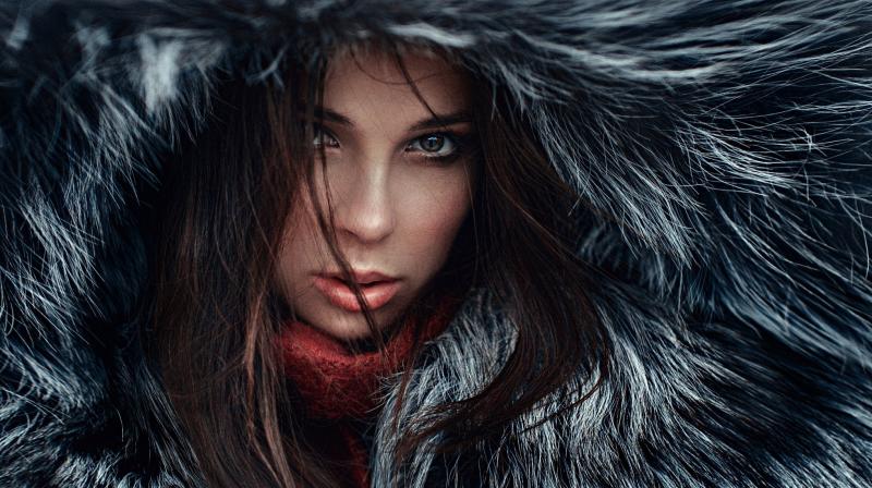 Девушка красотка в капюшоне с мехом