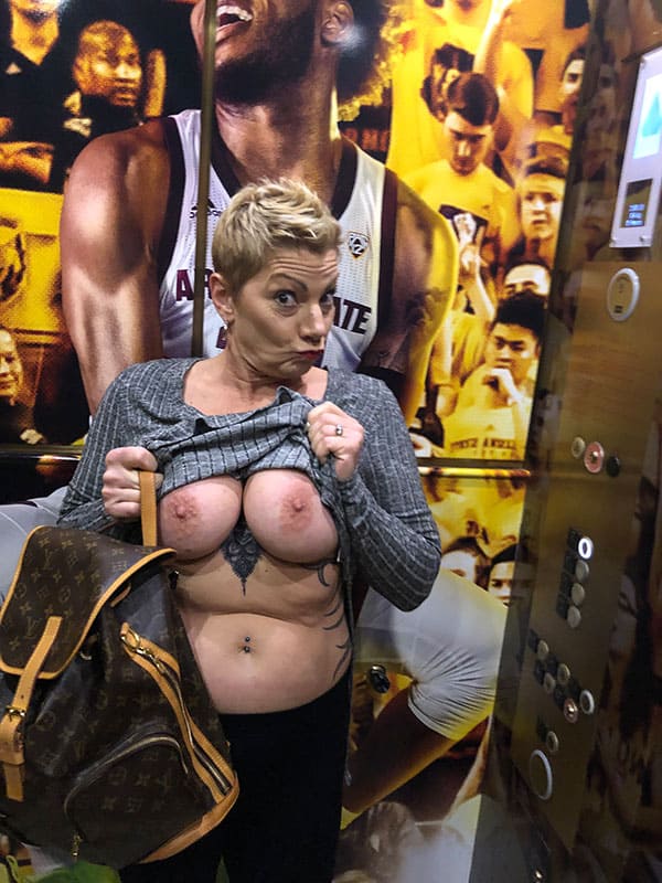 Зрелая жена любит пошалить в общественных местах, на этот раз бабёнка показывает свою большую грудь в магазине, а в частности в лифте.