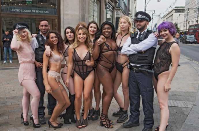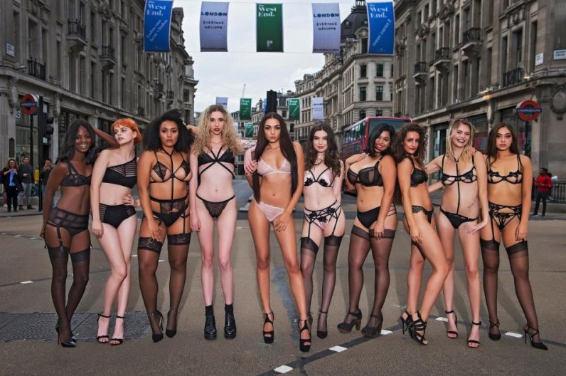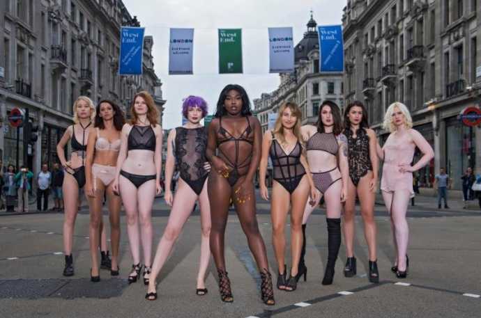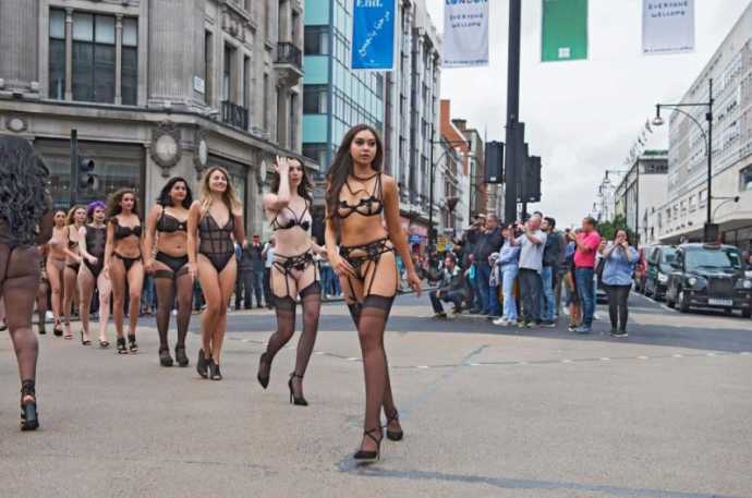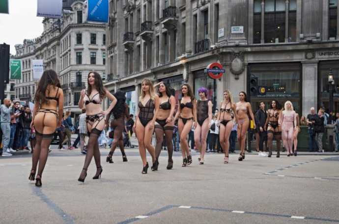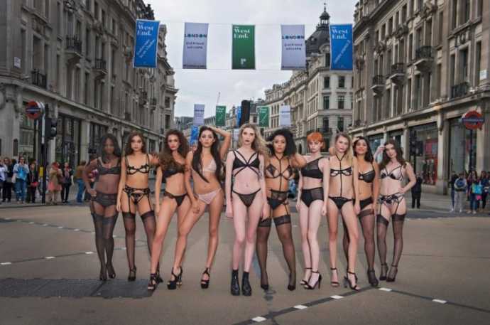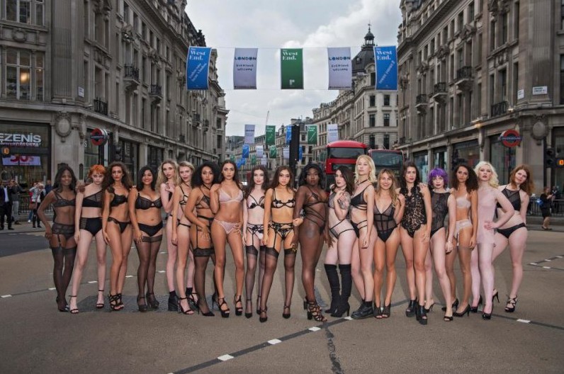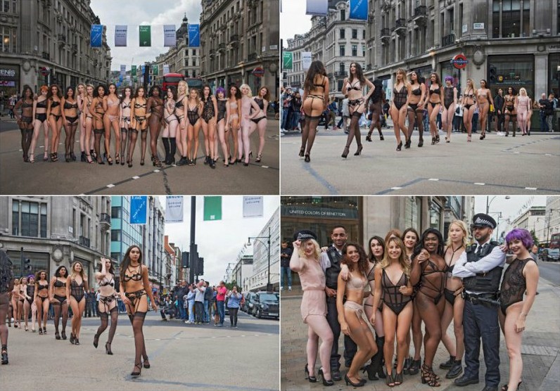 Интересную картину могли наблюдать прохожие днем 15 сентября на Оксфорд-Серкус в Лондоне. 19 полуголых женщин переходили дорогу, как зажигался зеленоватый свет. Организовала этот показ компания по пошиву нижнего белья Bluebella, чтобы минимизировать заторы в преддверии Английской Недельки Моды. Желающих выйти в белье на улицу Лондона находили через Instagram. Девушки, посреди которых были мед работник, две актрисы, музыкант и два писателя, кроме демонстрации белья, боролись с комплексами и боязнью оказаться фактически без одежды перед незнакомыми людьми на улице.