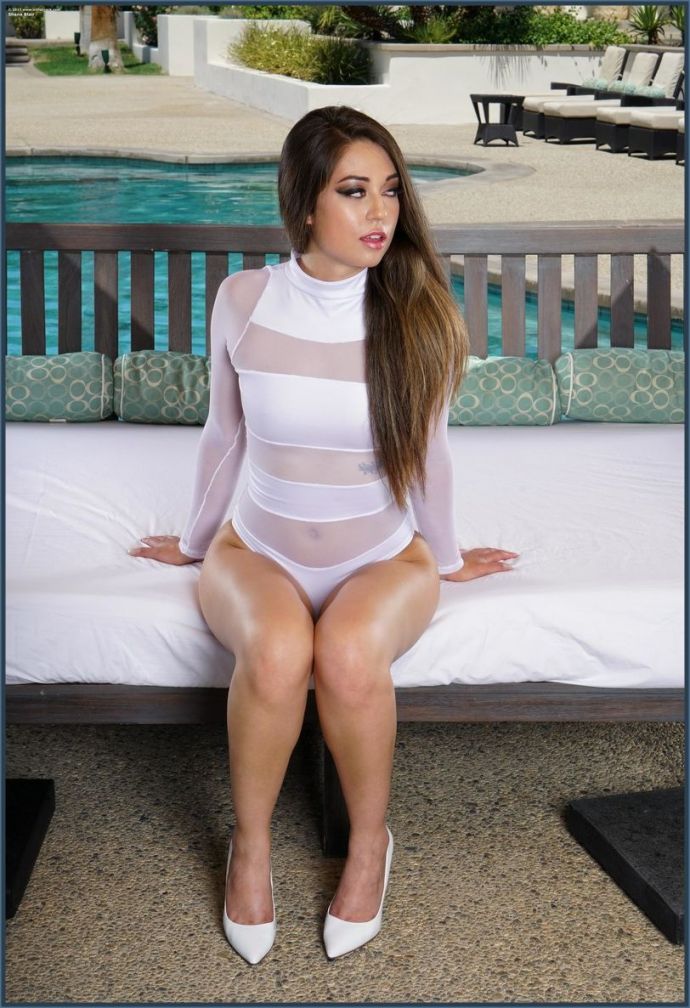 Брюнетка с большими глазами в новой коллекции от модельера демонстрирует купальник. Он отлично сидит на её сексуальном теле, трусики обтягивают упругую попку, но потом Shane Blair его сняла и стала возле бассейна совершено голая.