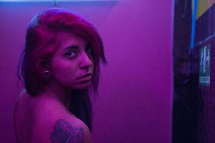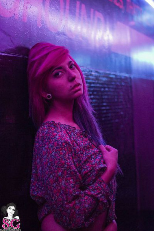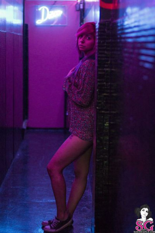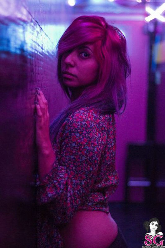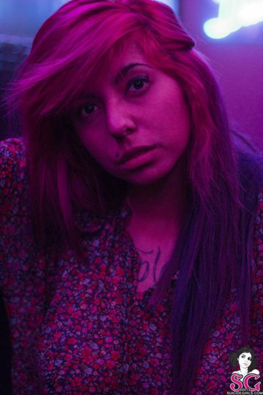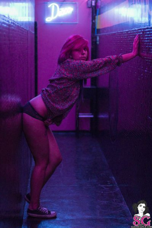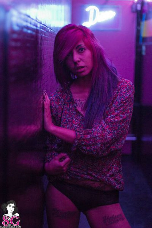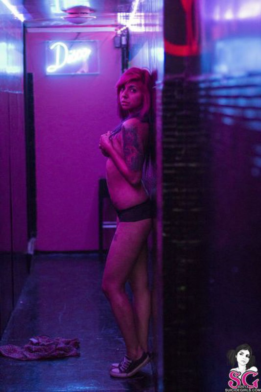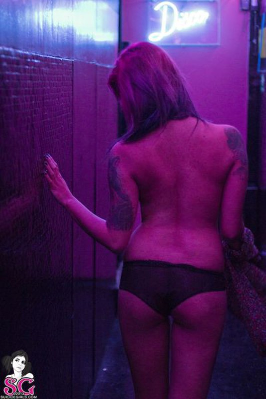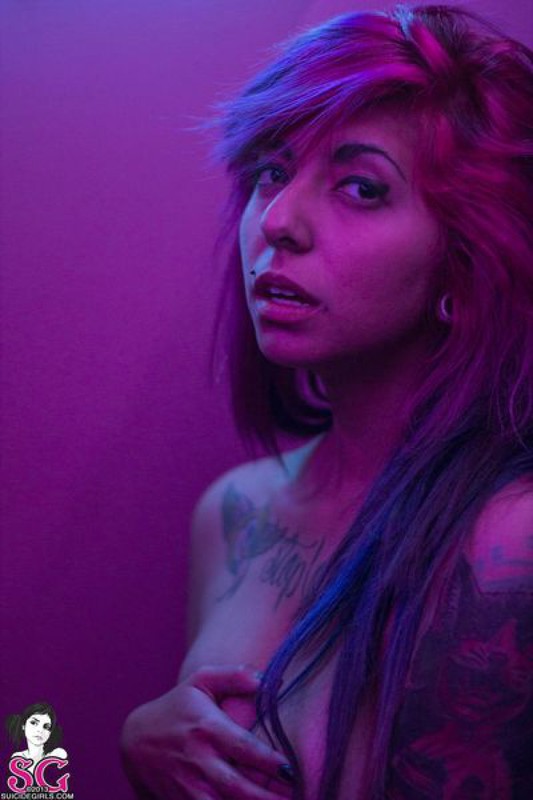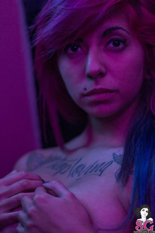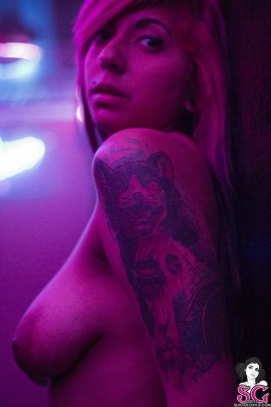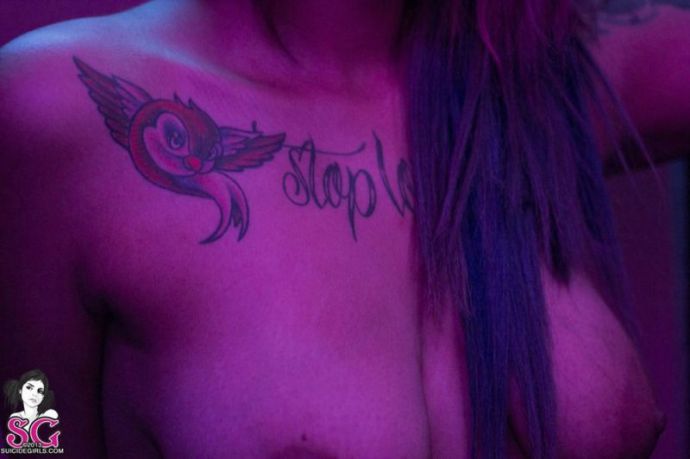 Девушка с татуировками по всему телу фотографируется под фиолетовый свет, не сказать, что круто, но на голые сиськи полюбоваться можно.