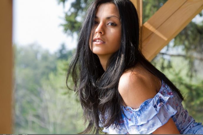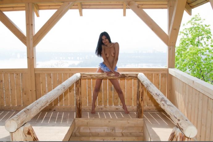 Милая латинская женщина отдыхает в отели со своем молодым человеком, который не теряет возможности делать интимные снимки на веранде открытого балкона.