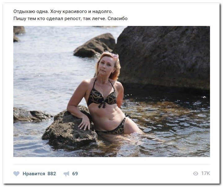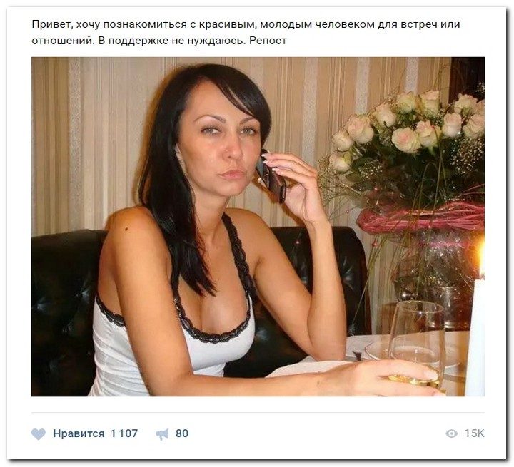 Когда женщины жаждут любви 03 сентября, 2017 13 555 Очередная партия веселых дам из групп «Знакомства со зрелыми» и т.п., которые ищут в интернете приключения на свою задницу. +4 Рубрика: Зрелые женщины / Знакомые