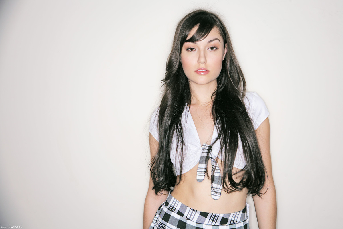 Молодая и сексуальная брюнетка Саша Грей фотографируется в белых чулках, короткой юбке и эротично завязанном топике. Затем модель начинает медленно раздевается и снимает с себя топ и показывает на камеру свои небольшие сиськи с коричневыми сосками. После этого крошка продолжает красиво позировать и мило улыбается на камеру!