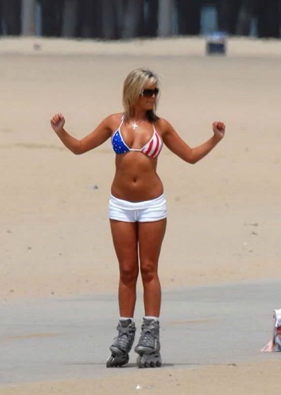 Стройные и спортивного телосложения красавицы катаются на роликовых коньках, они так сексуально одеты, что проходящий мимо парень по любому посмотрит на неё, особенно прекрасен вид сзади.