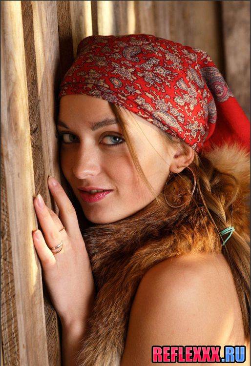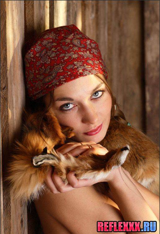 Вот такой трофей в виде шкурки со зверушкой на плече у девчонки. Хвастливая цыпочка голая и наглая, хочет блеснуть обнаженным телом, писю волосатую показать, а еще приводит в восторг попка красотки у сена. женщина обмотала голову платком, как-то по-деревенски, но на задницу это не влияет.