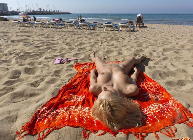 Белокурая нудистка наслаждается солнцем на пляже (14 фото)