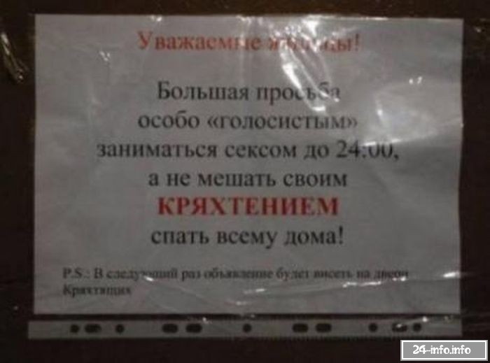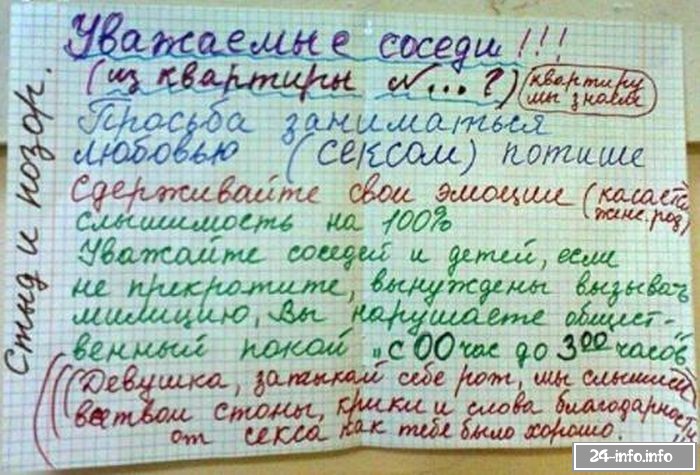 Многие из нас иногда так увлекаются любовными развлечениями, что совершенно запамятывают о том, что в большинстве домов тонкие стенки, и ваши соседи слышат все, что у вас происходит Именно после чего в подъездах возникают такие гневные "записки":)