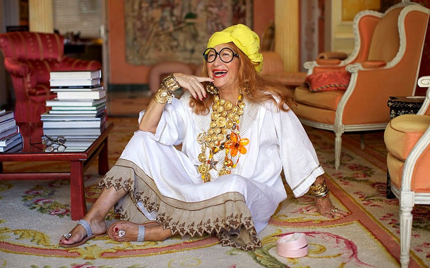 1. Женщина в желтоватом тюрбане, мультислойном колье и в огромных очках.