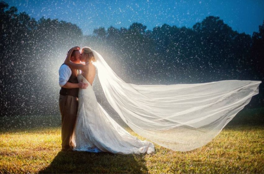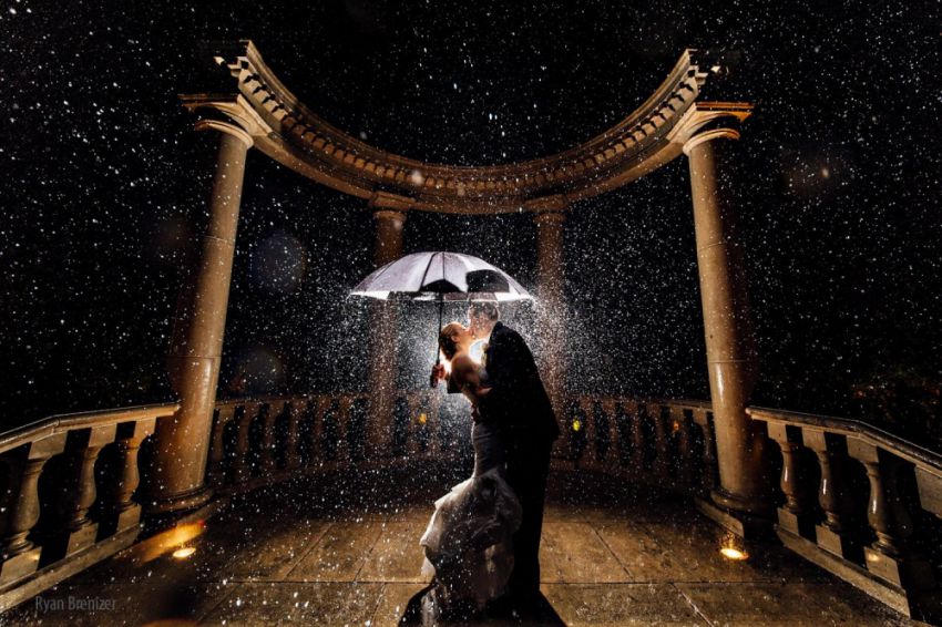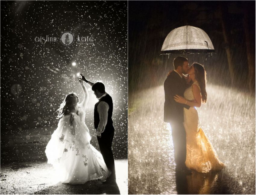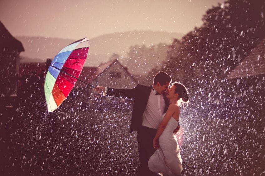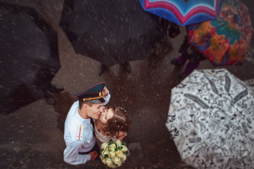 Дождь в день женитьбы — это не только лишь отменная примета для молодоженов, но и хороший шанс для фотографа сделать по-настоящему роскошные снимки. К тому же в дождливую погоду фото получаются в особенности прекрасными и романтичными. Получить такие кадры непросто, но зато они будут стоить каждой минутки, проведенной с мокрыми ногами.