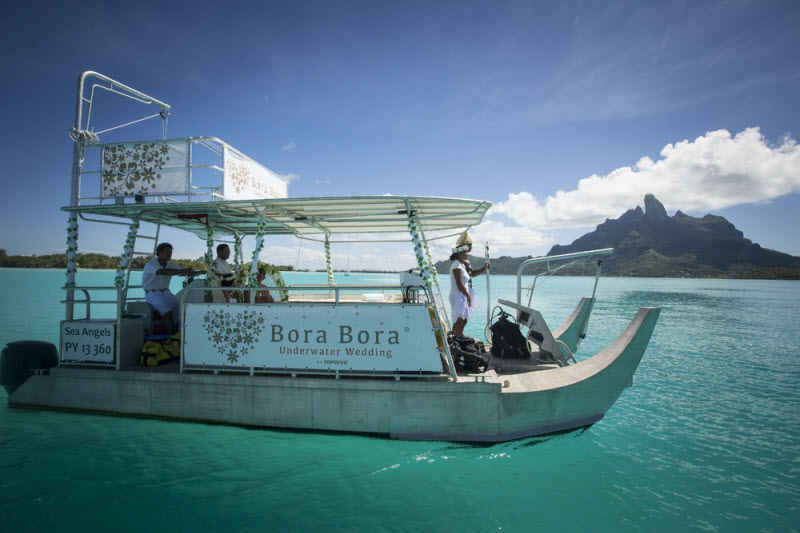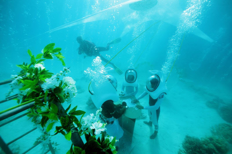 Потрясающая свадьба была организована дайвинг-клубом под заглавием Top Dive, который запустил новейшую концепцию свадебного туризма во французской Полинезии. Жених и жена — Nicolas и Alexandra из Мадрида, Испания, держались за руки, когда стояли перед Полинезийским священником. Для церемонии сделали алтарь из жемчуга, все происходило на глубине 4 метров и обошлось молодоженам в €2,700. Эта умопомрачительная свадьба свершилась 25 октября 2014 года.
