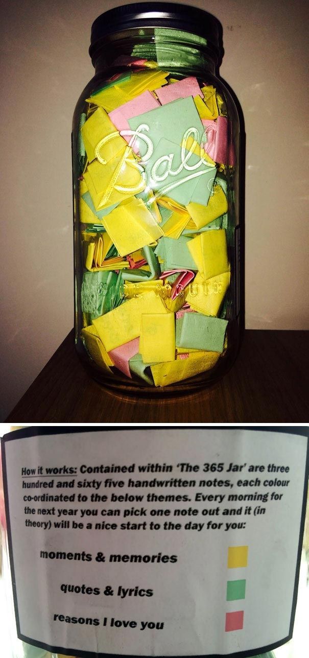 "Как это работает: Банка «The 365 Jar» содержит в себе 365 написанных вручную записок, каждая из которых помечена цветом в соответствии с её темой. Каждое утро следующего года ты будешь брать по одной записке (в теории), чтобы твой день начинался с чего-нибудь хорошего"