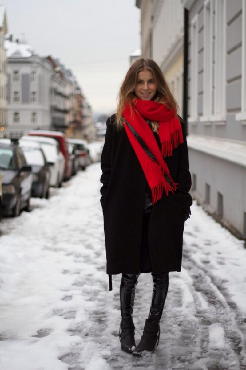 Девушка красотка в шарфе и в пальто на весь рост с размытым фоном