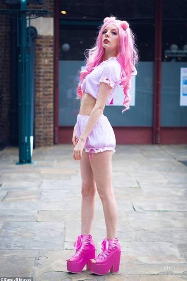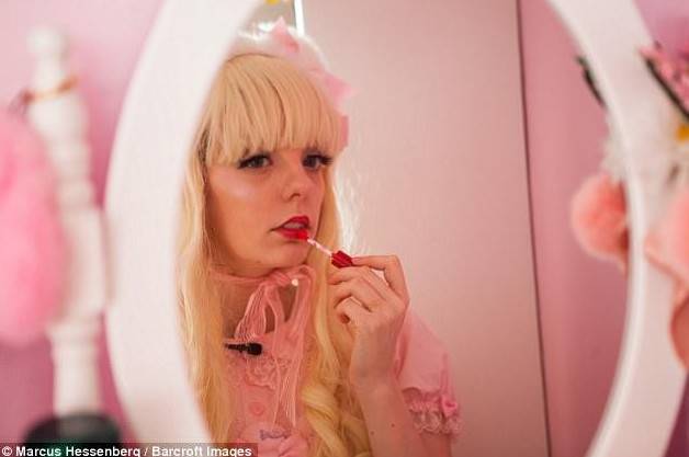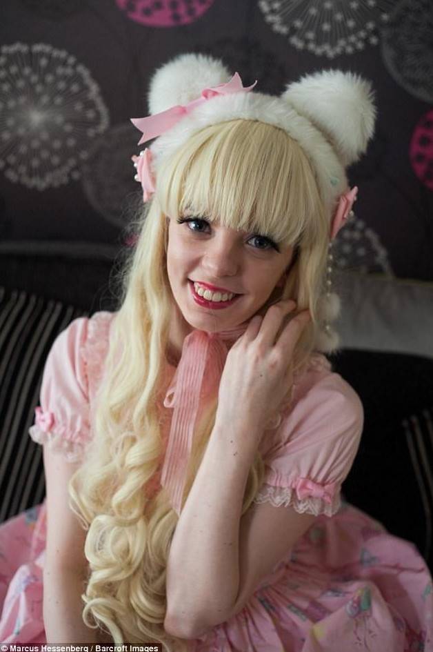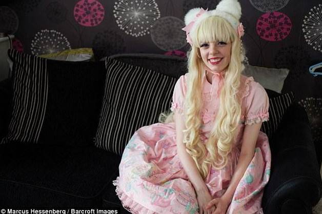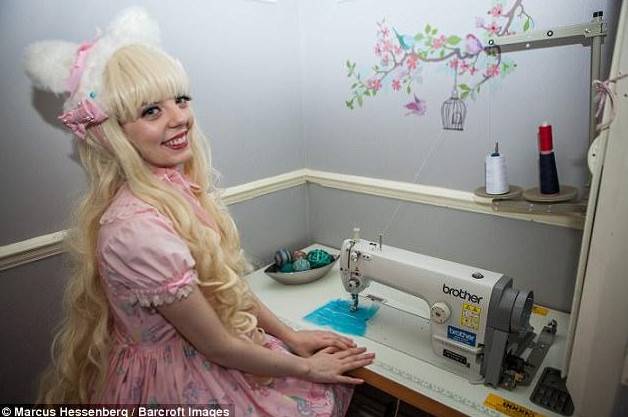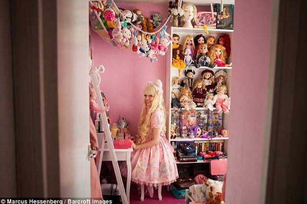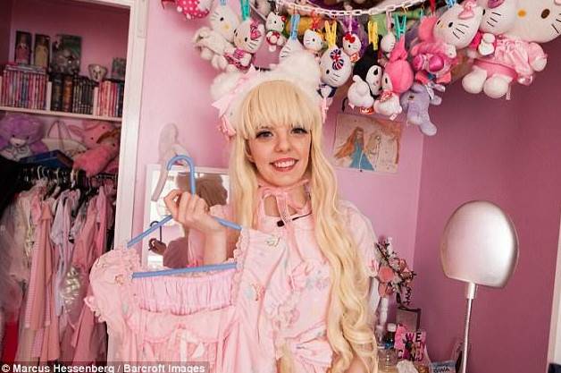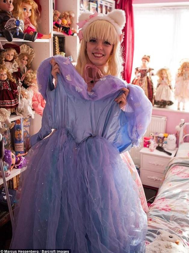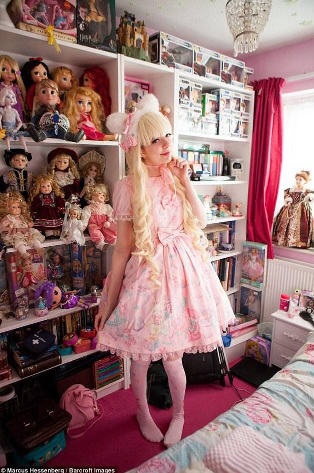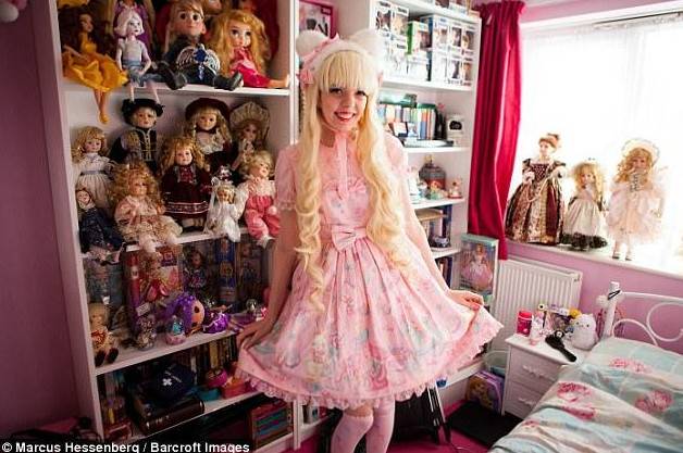 Вот эта странная девушка, которая потратила 20 000 фунтов стерлингов, чтобы выглядеть как кукла. Ее зовут Джейд Смит, ей 21 год, она родом из Великобритании и потратила много денег на такие вещи, как одежда для кукол, обувь, парики и игрушки. Она носит круглые контактные линзы, чтобы увеличить размер глаз, и встает в 4 утра, чтобы успеть накраситься и одеться. У нее около 40 пар обуви и огромное количество платьев. Ее комната украшена подшивками комиксов, полками с диснеевскими куклами, рисунками "Hello Kitty" и "My Little Pony" - она больше похожа на комнату малыша, чем на комнату 21-летней девушки. Джейд, однако, живет с родителями и младшими сестрами.