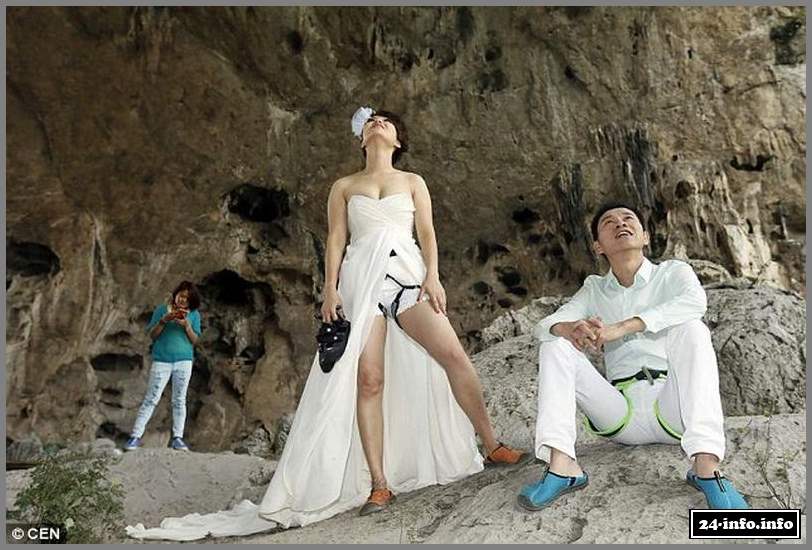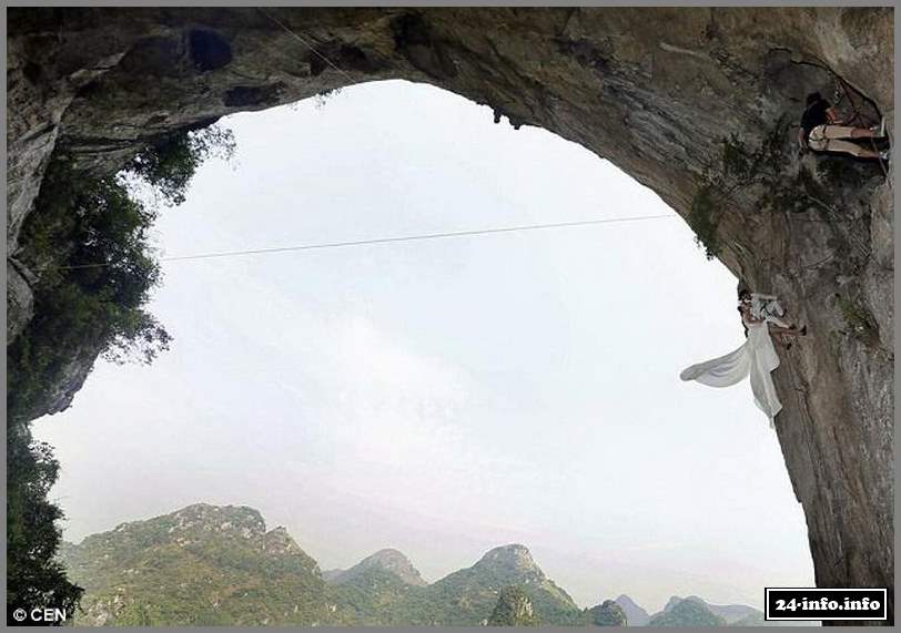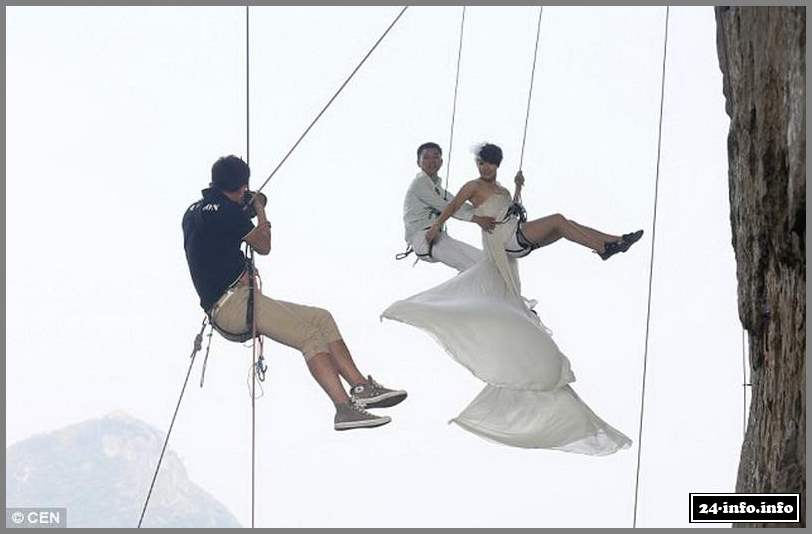 Китайские молодожены провели свадебную фотосессию на склоне горы во время подъема, пишет газета Metro.