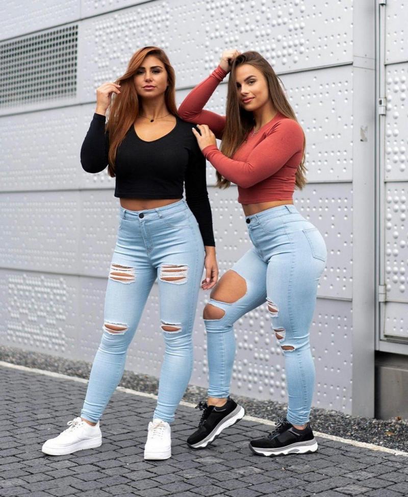 Очаровательные девушки в обтягивающих джинсах и шортиках