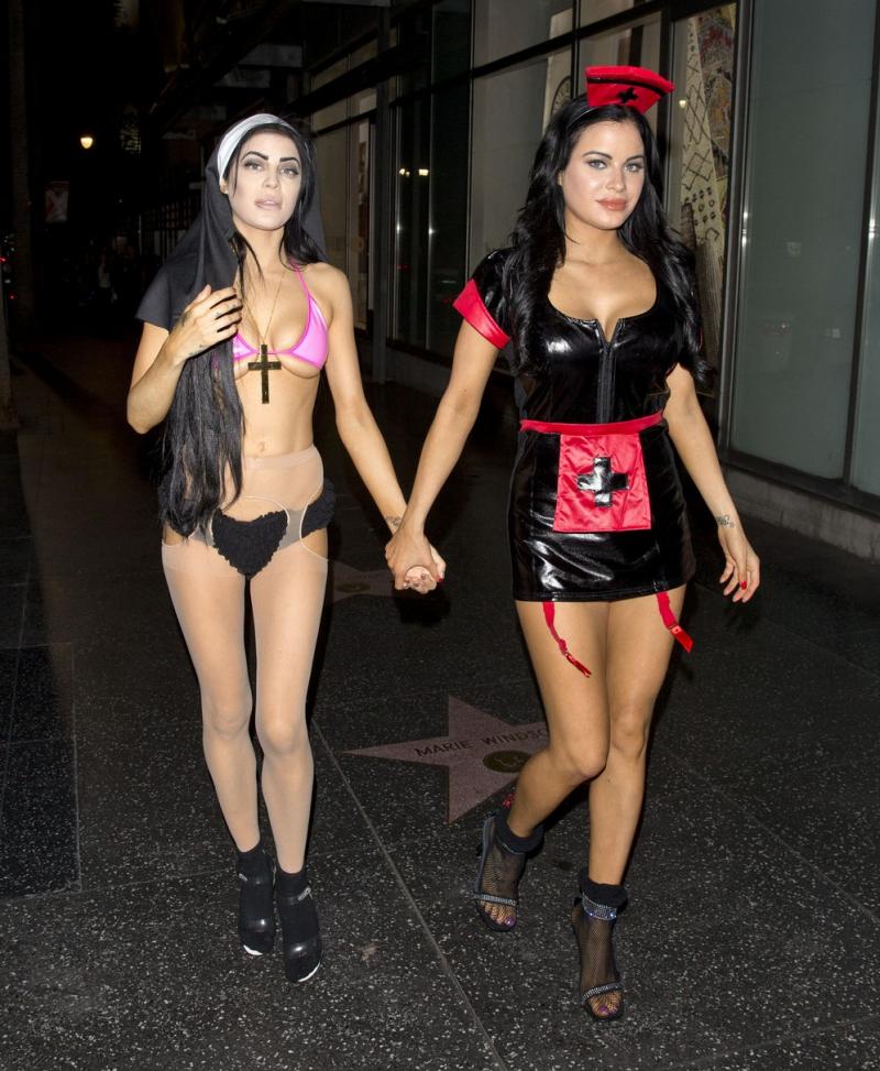 28-річні британські моделі Playboy, сестри-близнюки Карла та Мелісса Хоу, у сексуальних вбраннях прибули на вечірку на честь Хеллоуїна до ресторану Katsuya у Голлівуді.