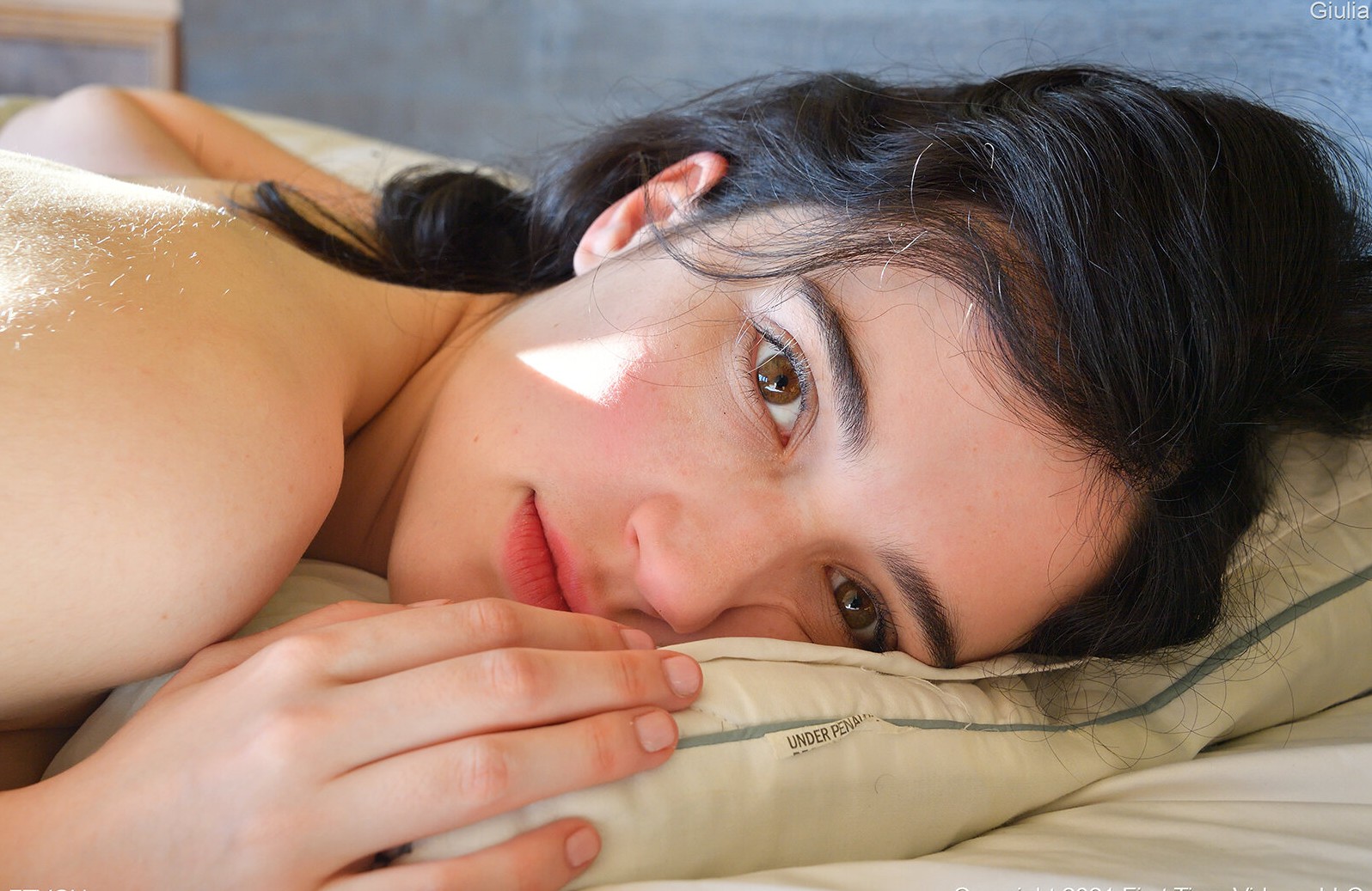 Тільки що прокинувшись, сонна гола дівка з великими висячими цицьками розслаблено лежить в м'якій ліжку і чуттєво потягується всім тілом. Готова вставати з ліжка, брюнетка грайливо кривляється перед камерою, розпусна випнувши свої доїння і мигцем засвічує гладкий лобок.