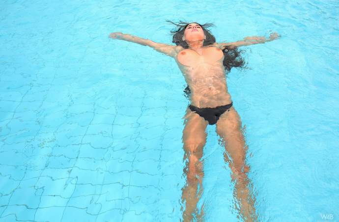 Вдосталь наплававшись в прохолодному басейні, гаряча мокра брюнетка з сексуальним тілом чуттєво позує перед камерою в одних лише трусиках. Щосили світячи своїми великими соковитими буферами, розпусна баба збудливо випинає свою красиву пружну дупу і, зсунувши в бік труси, показала голену соковиту пи*ду зі стрижкою на лобку.